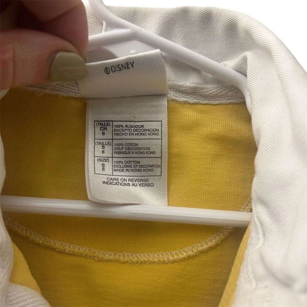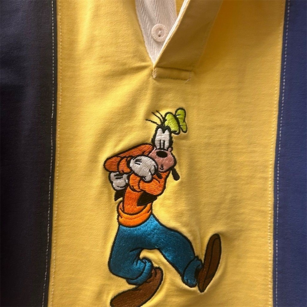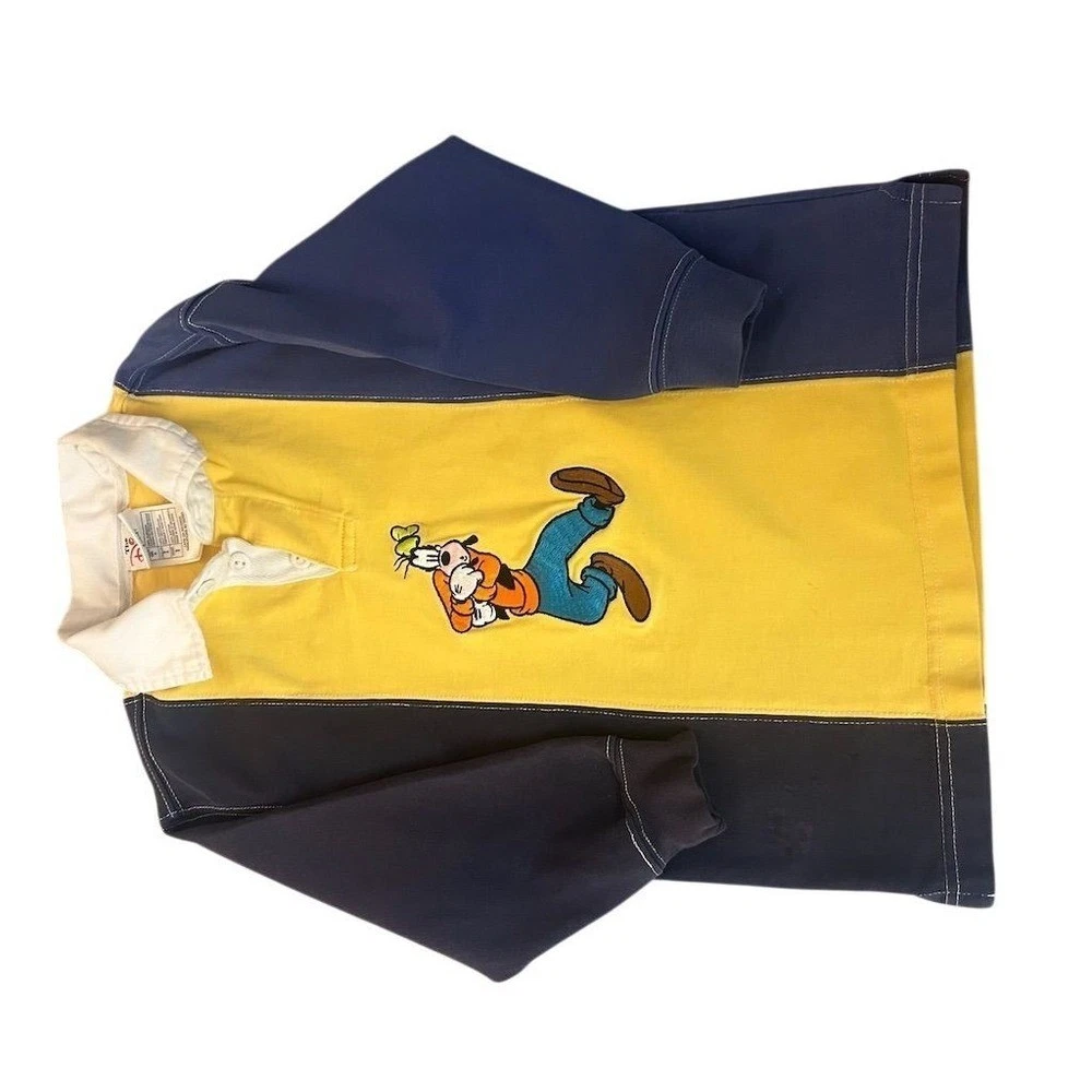 Kids Disney Store rugby shirt featuring Goofy in an embroidered graphic. This long sleeve top has a classic polo collar with a button placket and a color block design in yellow and navy blue. Perfect for casual outings or themed park visits. Fading present and stain noted please review pictures. Department: Unisex Kids Type: Polo Sleeve Length: Long Sleeve Character: Goofy Theme: Disney Closure: Button Fabric Type: Cotton Performance/Activity: Rugby Pattern: Colorblock Material: 100% Cotton Neckline: Collared Style: Pullover Features: Contrasting Trim, Breathable Fit: Regular Accents: Embroidered, Logo Keywords: Disney Store, Goofy graphic, color block, polo shirt, long sleeve, kids apparel, childrens wear, character shirt, casual top, theme park, cotton blend, playtime, school, everyday All items come from a smoke free, pet friendly home. All of items unless NWT or Dry Clean Only are washed with Tide. We try our best to disclose any flaws with items, if we miss something please reach out and let us know. We offer combined shipping on all our items. We do take measurements of our clothing listed for sale. Please compare the measurements to something you already own.