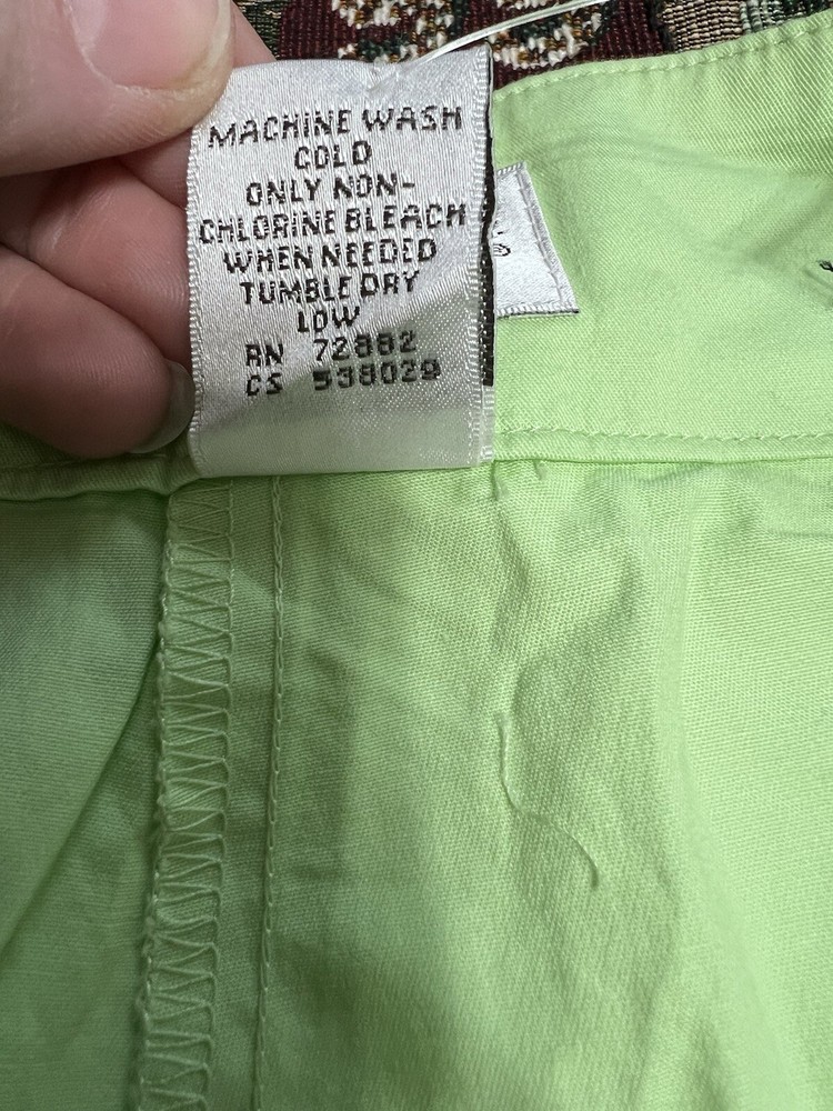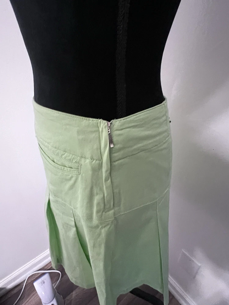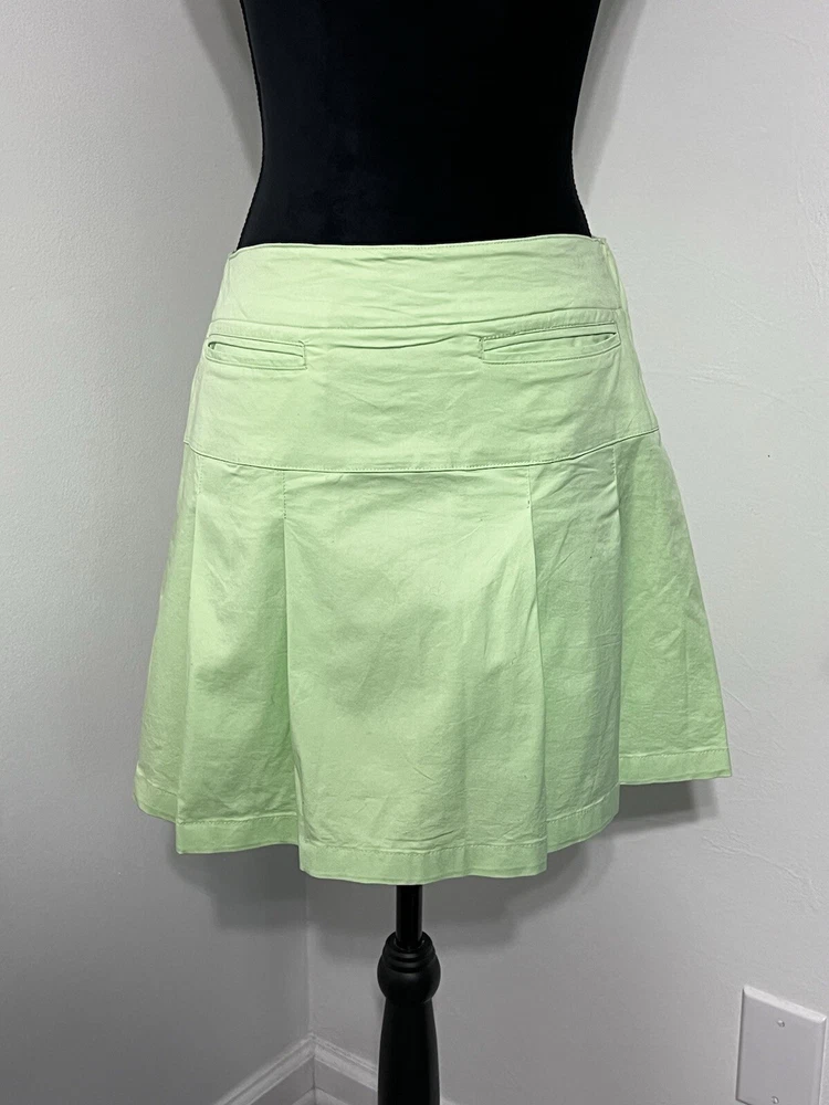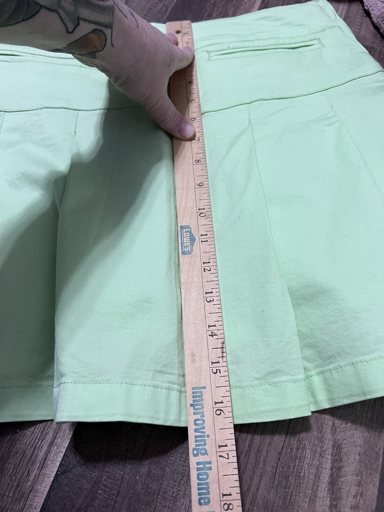 This vintage Y2K mini skirt skort in a light green color is a stylish and versatile piece for women size 6. The skirt features a pleated design with a preppy style, perfect for various occasions like golf, tennis, parties, or casual outings. Made from a stretchy knit fabric blend of spandex and cotton, this mini skirt has a mid-rise and button closure. It also has a touch of 2000s and school girl aesthetic, making it a fun addition to any wardrobe. New without tags!