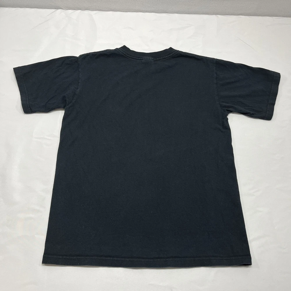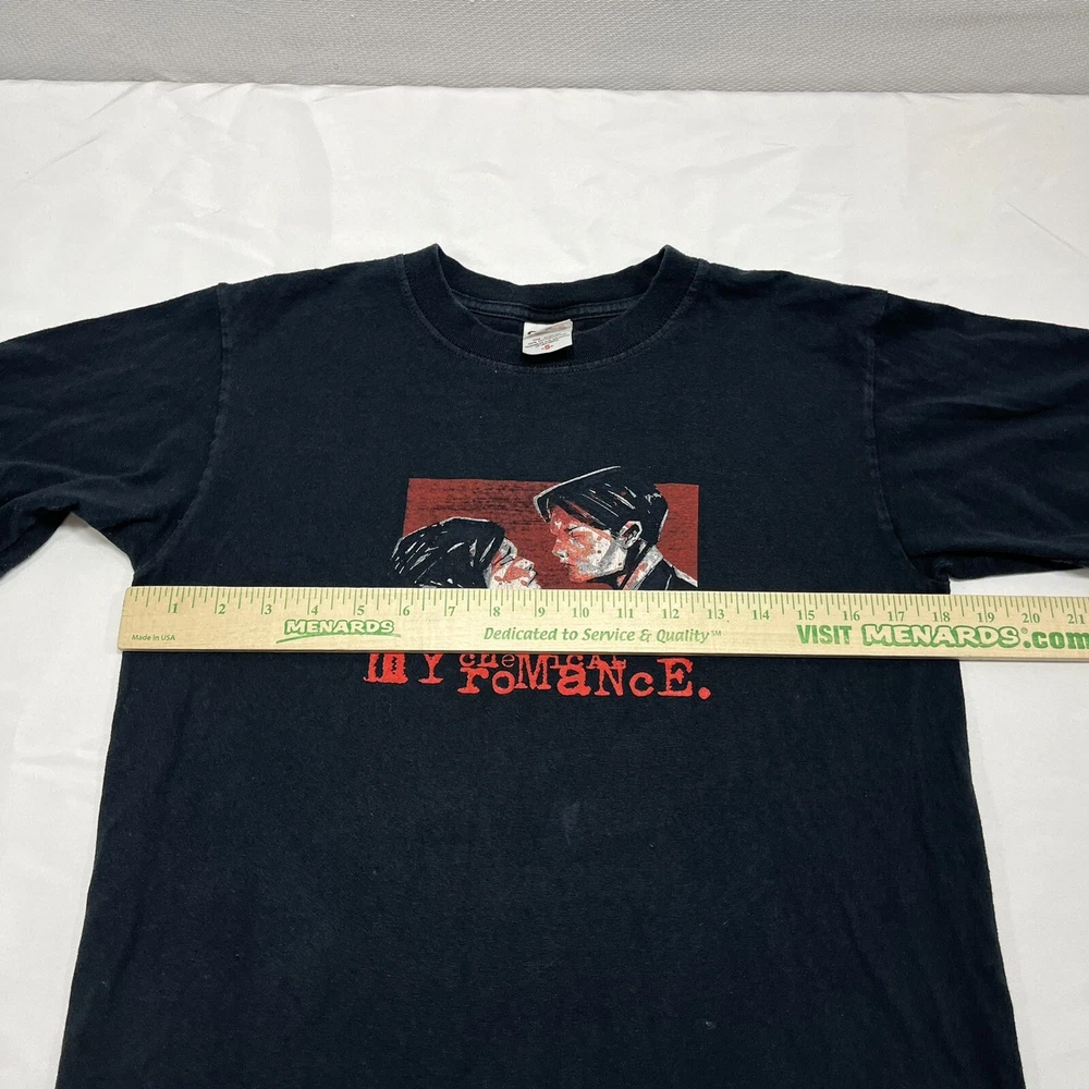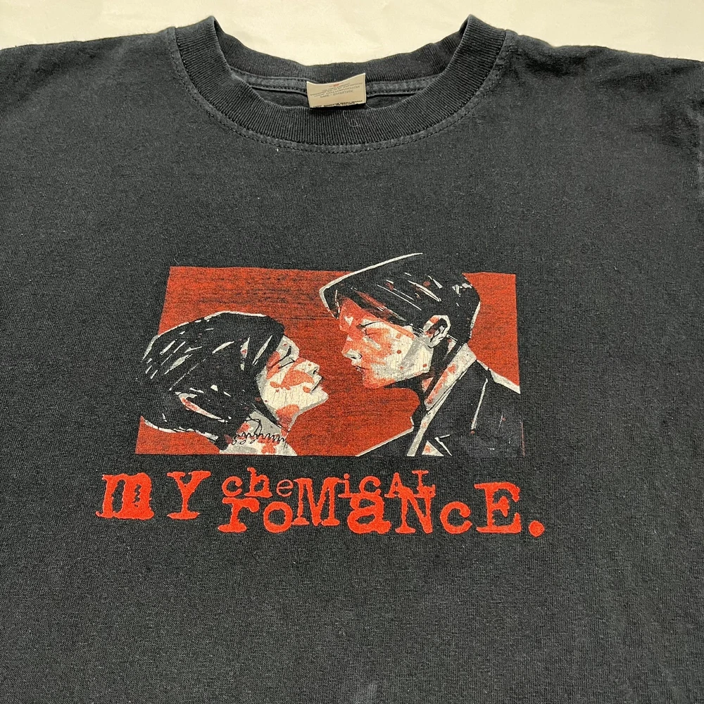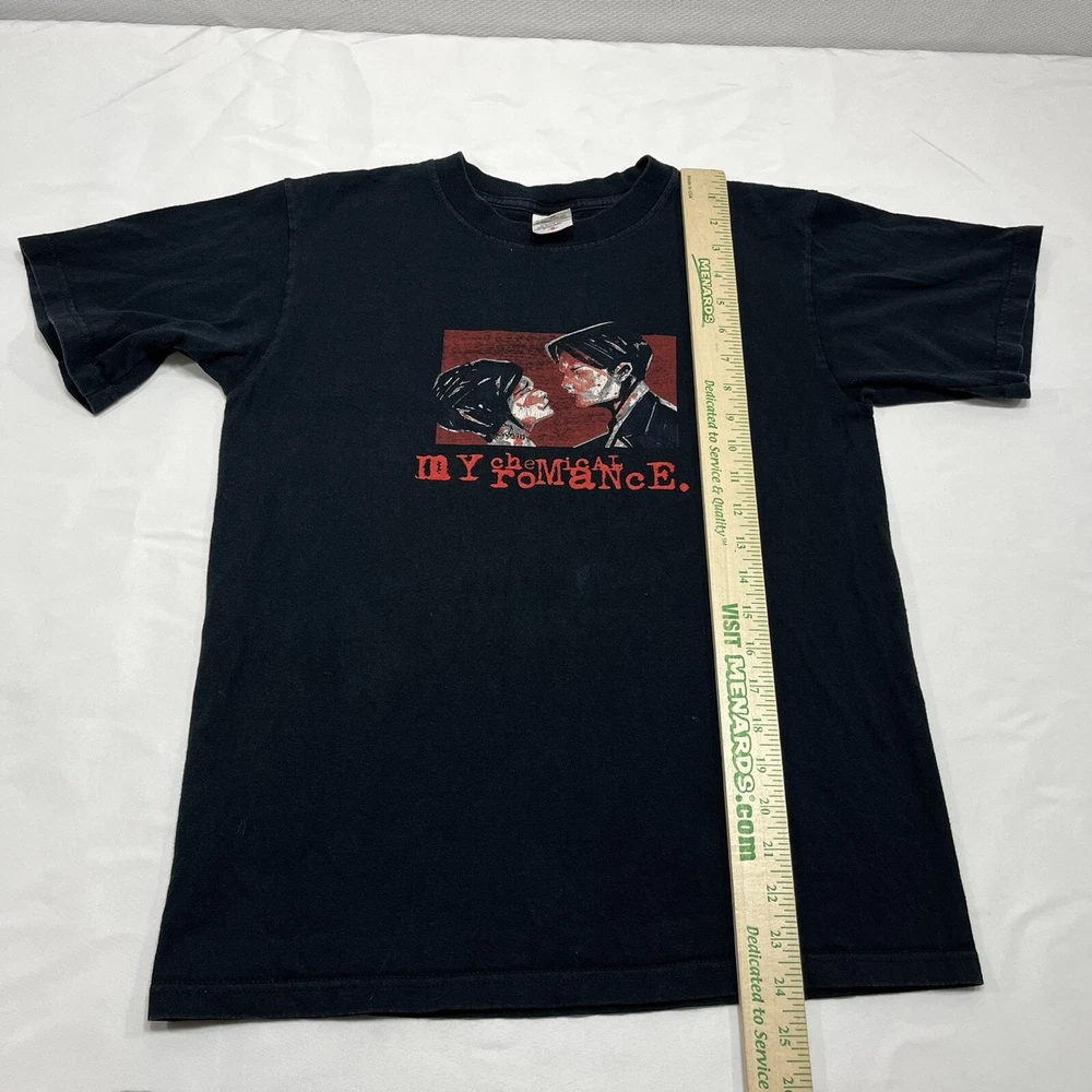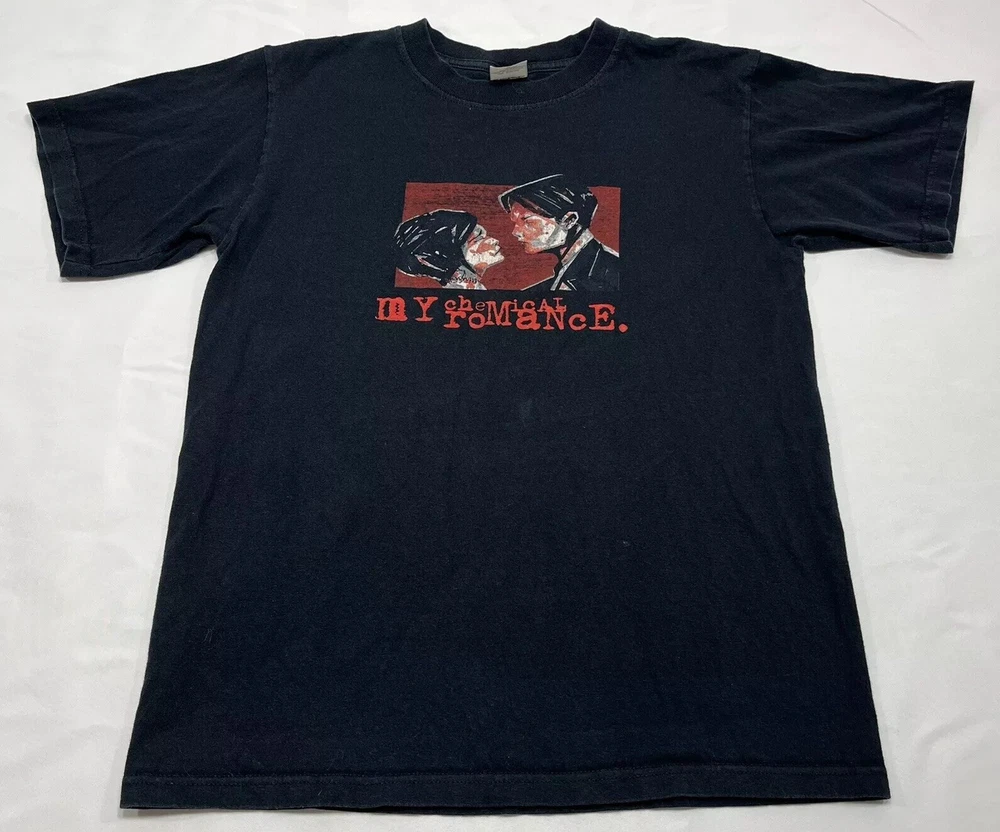 This vintage Y2K t-shirt features the iconic My Chemical Romance band tee design, with the album title "Three Cheers For Sweet Revenge" and the year "1998". The black unisex t-shirt is a size small and is machine washable for easy care. The shirt is perfect for fans of rock, punk, and vinyl records, as well as those who appreciate rare and hard to find merchandise. The shirt is ideal for any season, whether it be winter, summer, fall, or spring, and is perfect for wearing to concerts, festivals, or just around town. The shirt is a great addition to any music lover's collection and is sure to turn heads with its unique design and vintage appeal.