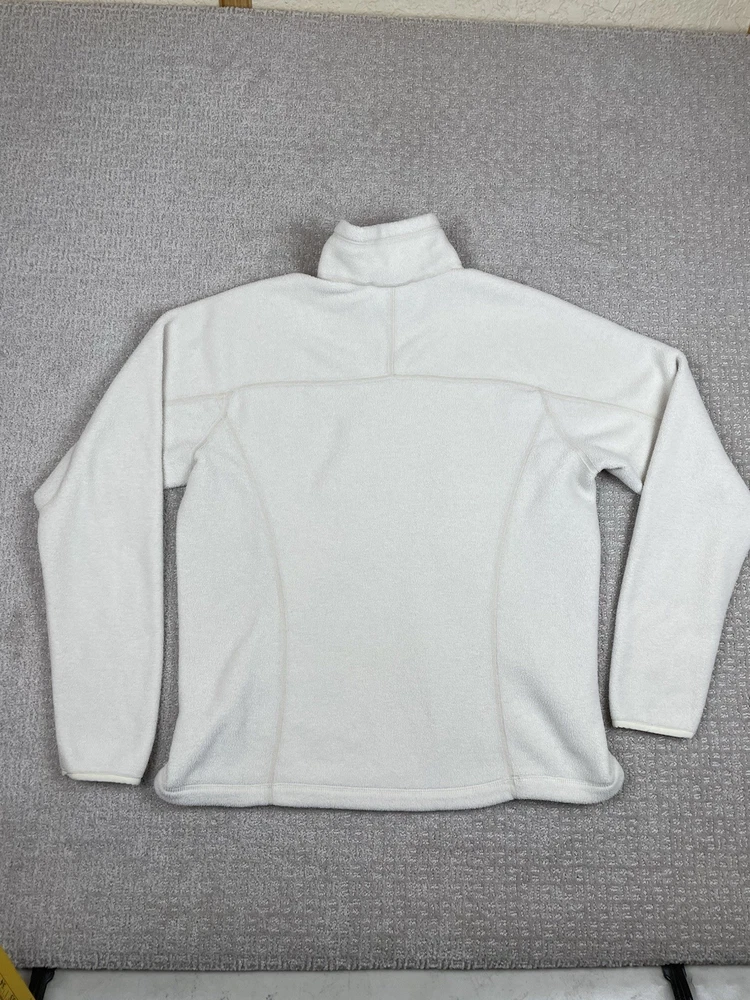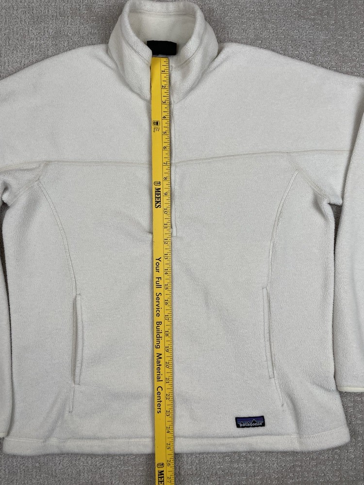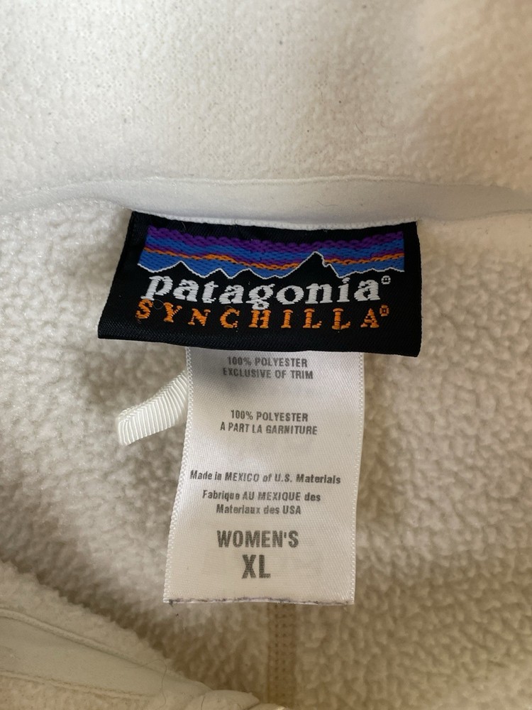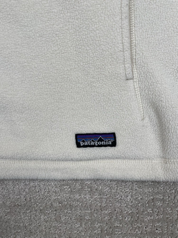 The VTG Y2K Patagonia Synchilla Jacket is a classic piece from the early 2000s featuring a stylish muppial 1/2 zip design in a timeless white color. Made from polyester fleece, this pullover jacket offers both comfort and warmth, making it a versatile addition to any wardrobe. The full zip closure and solid pattern add to the overall appeal of this iconic Patagonia piece, perfect for outdoor activities or casual everyday wear.