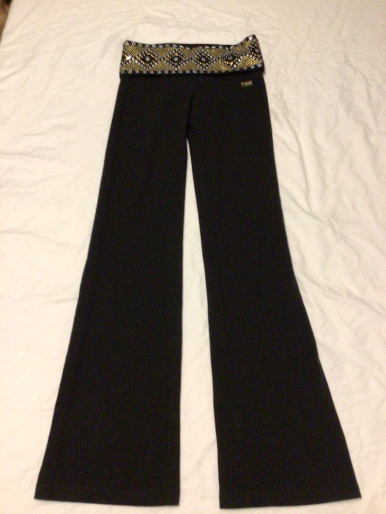 You are buying rare vintage Y2K 2000s, Victoria's Secret, PINK, bling gold and silver tone studded, fold over waist, yoga pants. The pants are size XS with a bootcut flare leg. They are in great condition, no studs are missing. Sorry I do not accept returns. All sales are finale. thanks for looking.