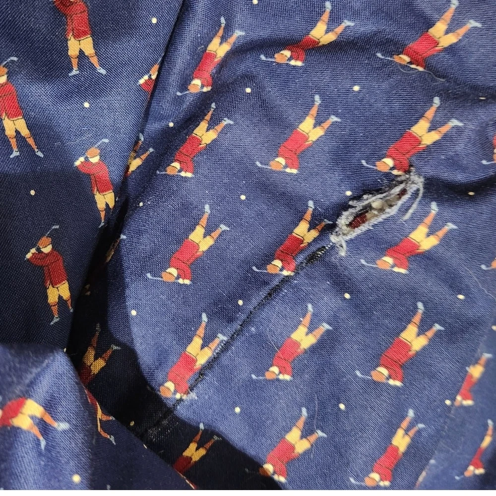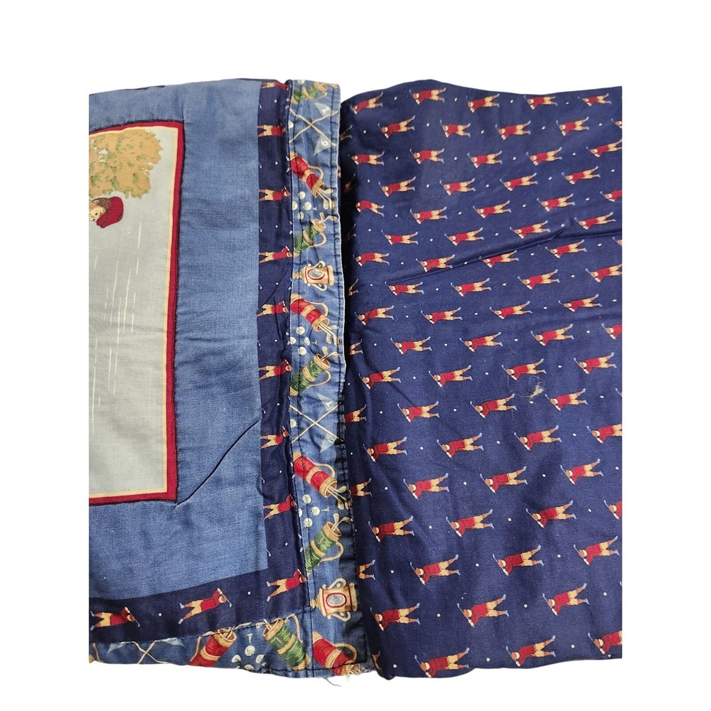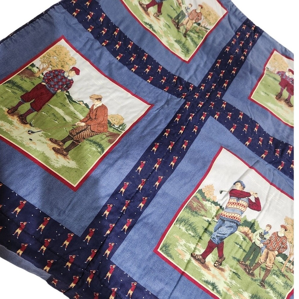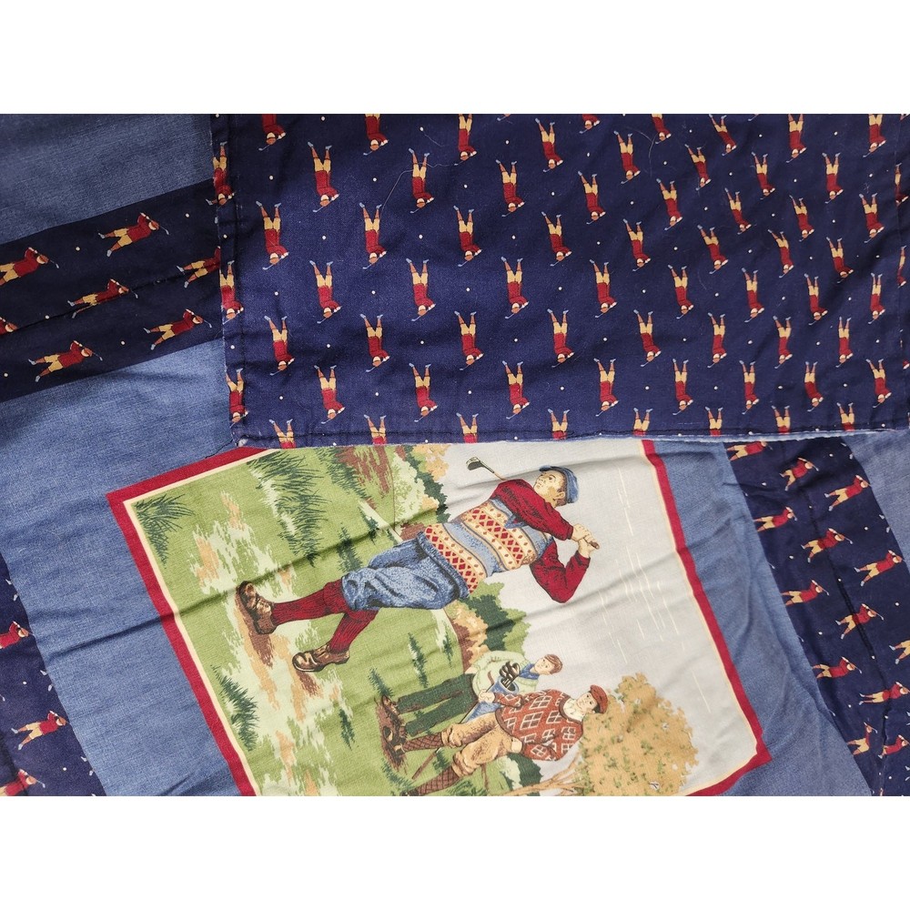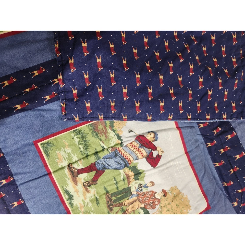 Golf quilt that folds up into a "storage pocket" making it easy to fold up and put away or display. The main side features scenes of vintage golfers and the back panel has tiny golfers with a navy blue background. The fold up design makes it perfect for storage when not in use or for bringing as a picnic blanket! The quilt is in great condition with a minor flaw on one of the seams near the pocket. Please see last photo. The interior batting has been moved around, probably from being washed, but overall this quilt is still in great vintage condition. Approximately 48" x 53"