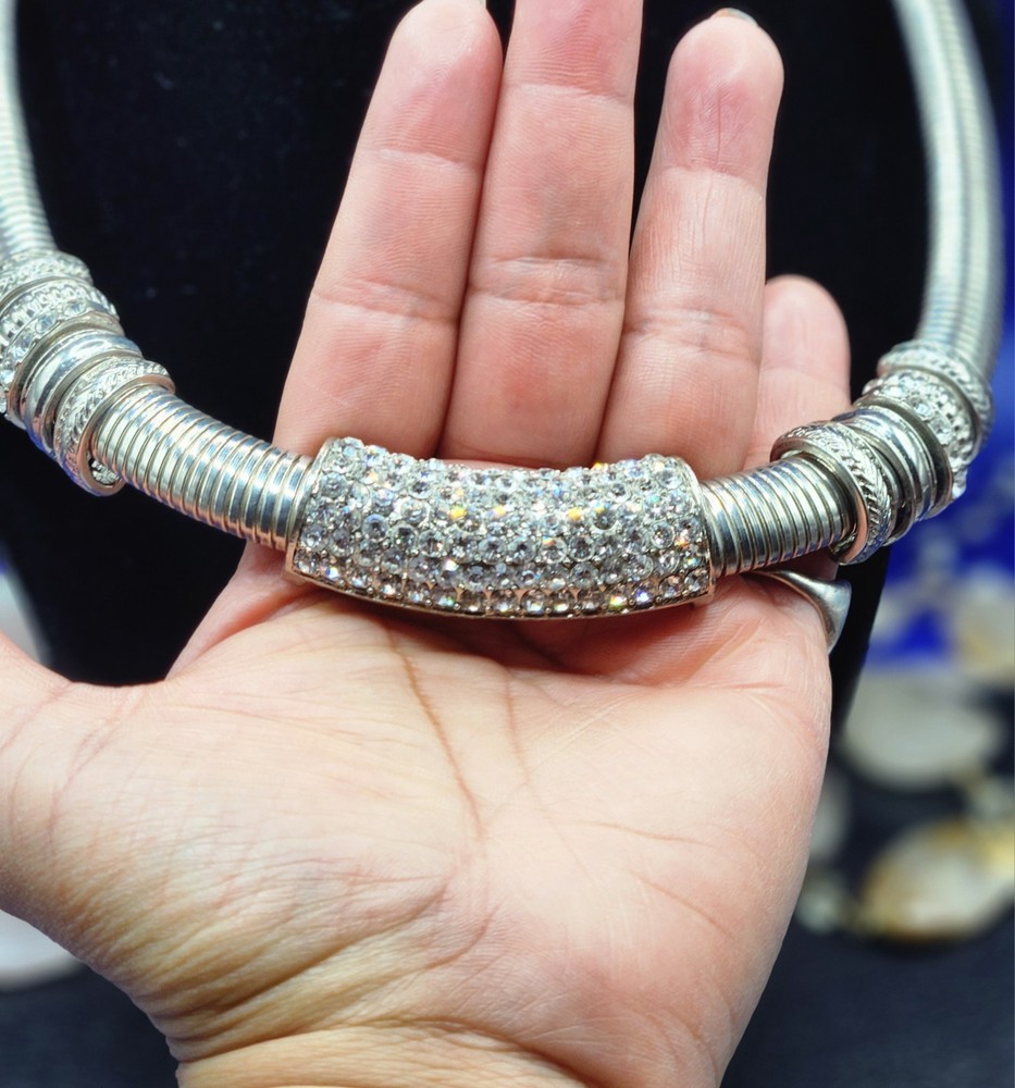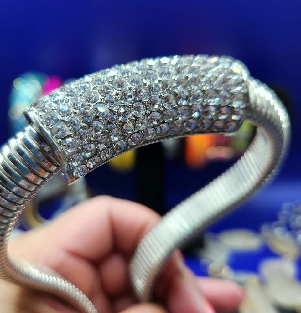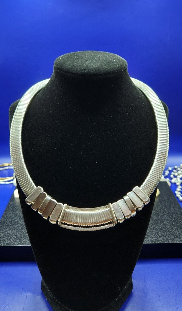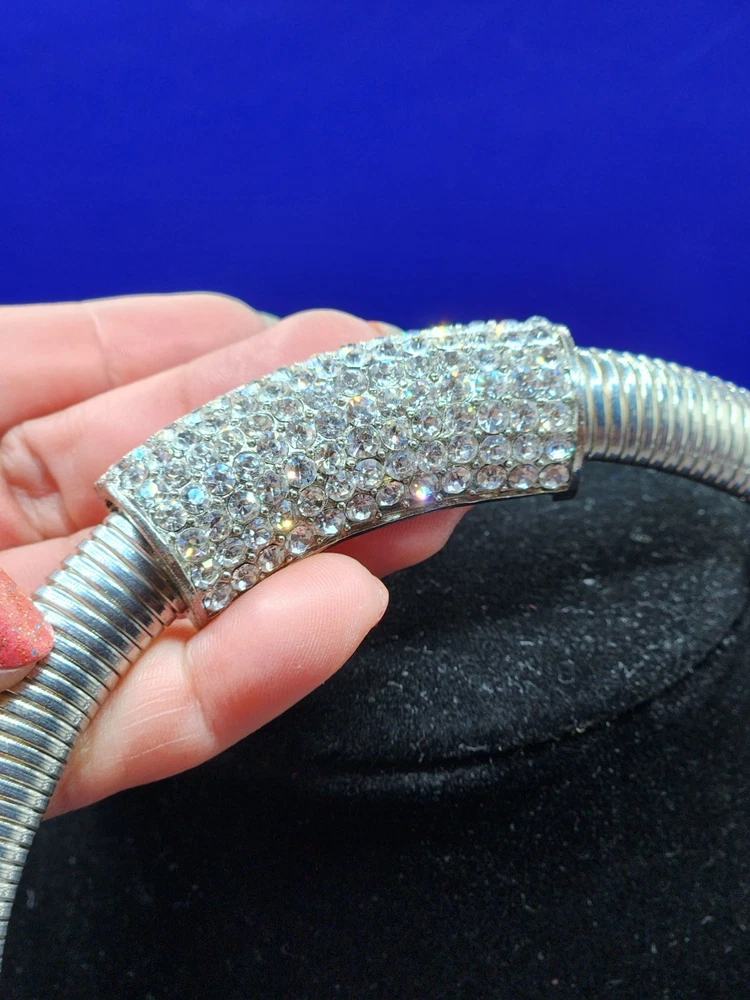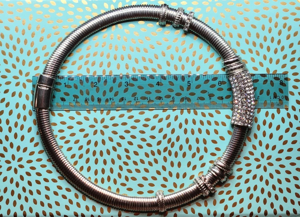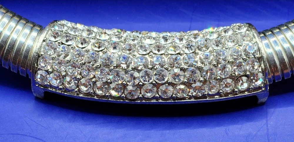 The VTG snake omega choker necklace features a silver tone metal chain with clear rhinestones set in a pendant bar. The magnetic closure ensures a secure fit, and the vintage design adds a touch of retro flair to any outfit. This choker necklace, measuring 16 inches in length, is a fashionable piece perfect for women who love bold statement accessories with a 1980s style.
