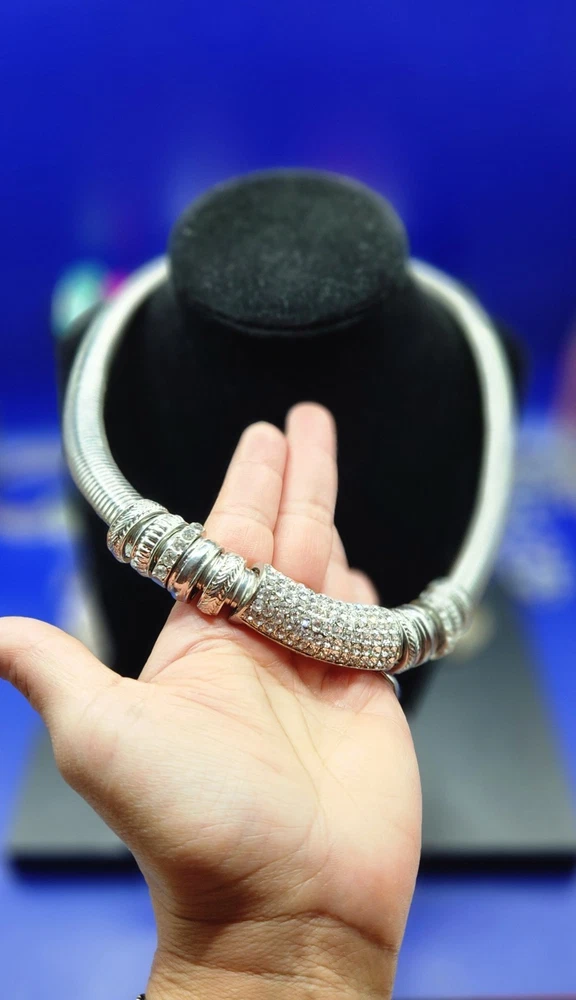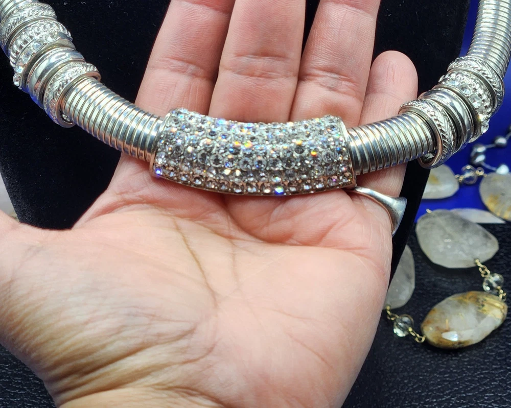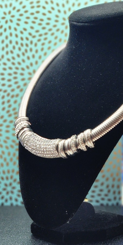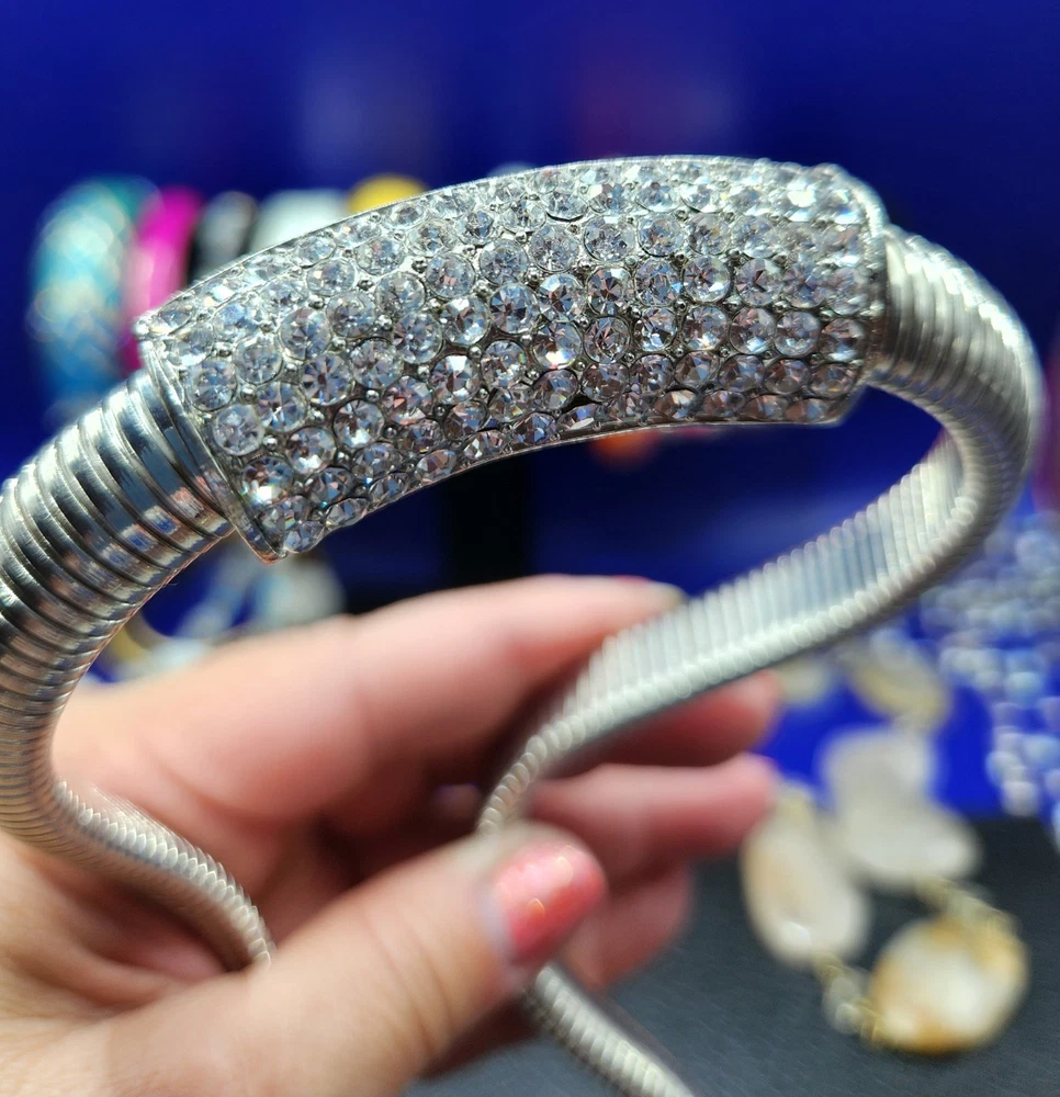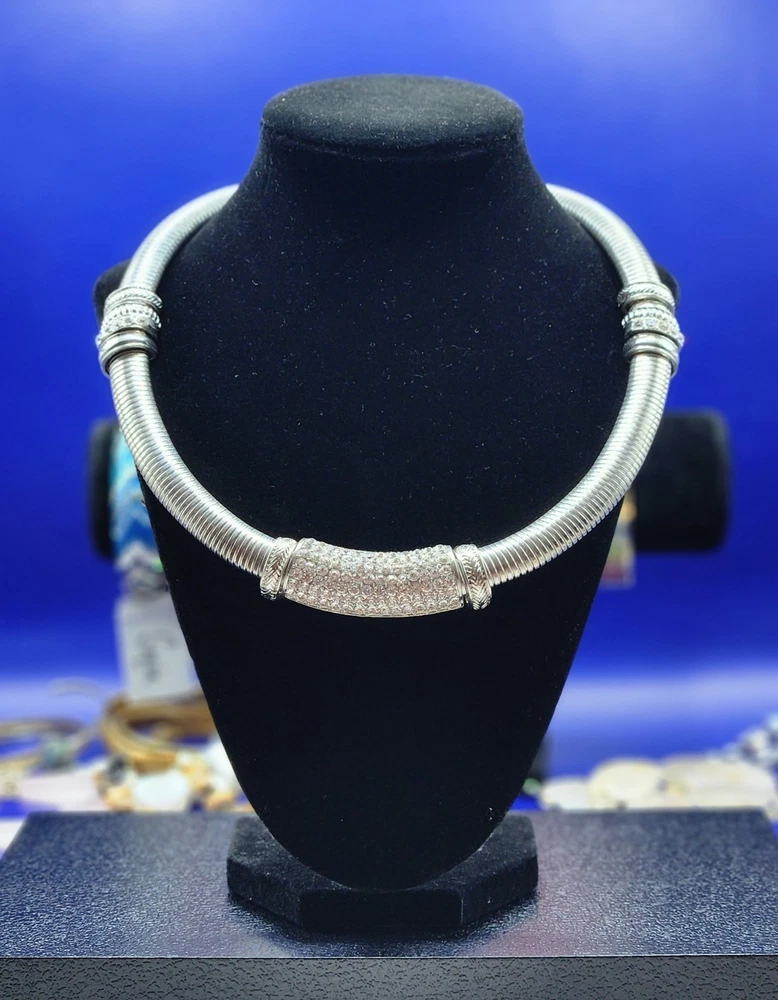 The VTG snake omega choker necklace features a silver tone metal chain with clear rhinestones set in a pendant bar. The magnetic closure ensures a secure fit, and the vintage design adds a touch of retro flair to any outfit. This choker necklace, measuring 16 inches in length, is a fashionable piece perfect for women who love bold statement accessories with a 1980s style.