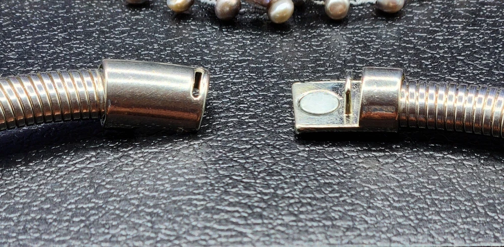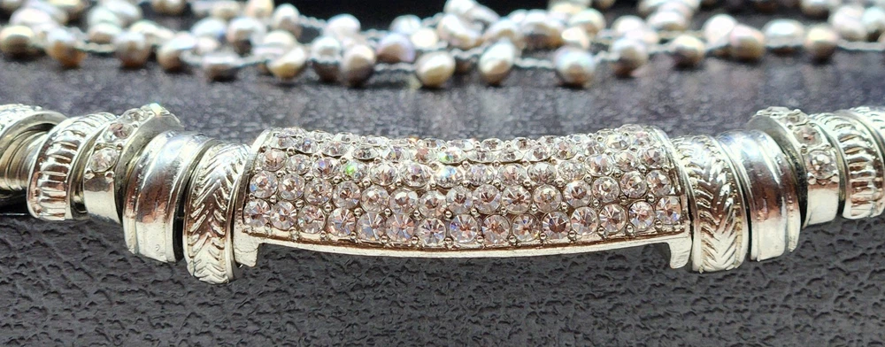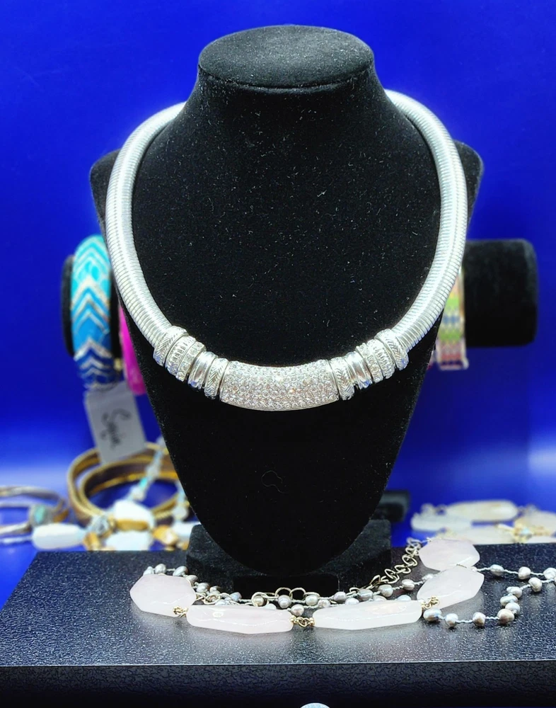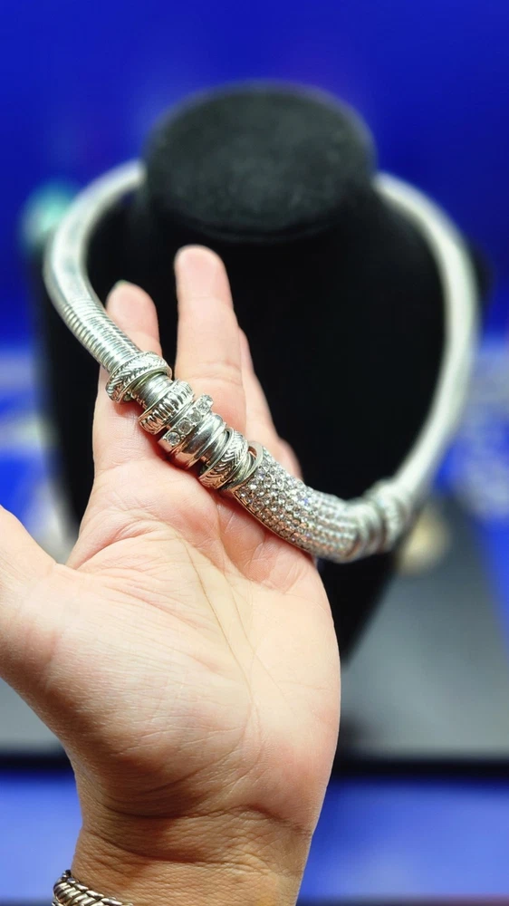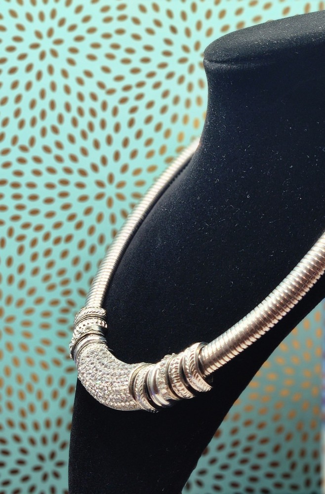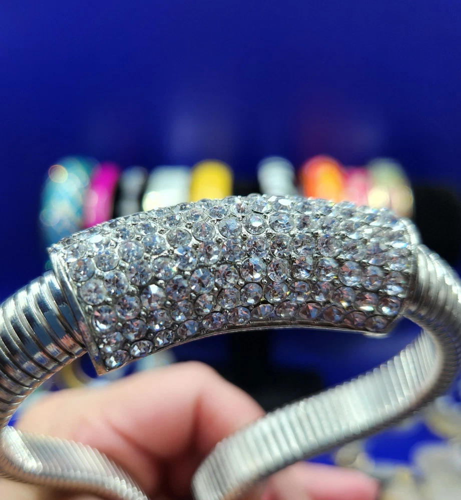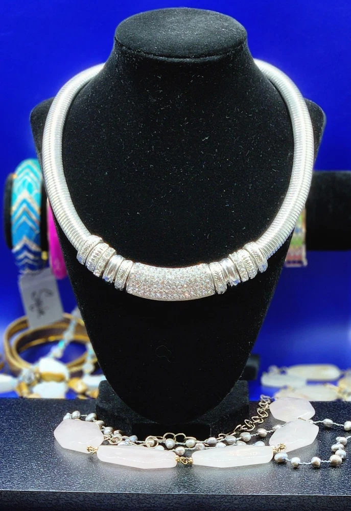 The VTG snake omega choker necklace features a silver tone metal chain with clear rhinestones set in a pendant bar. The magnetic closure ensures a secure fit, and the vintage design adds a touch of retro flair to any outfit. This choker necklace, measuring 16 inches in length, is a fashionable piece perfect for women who love bold statement accessories with a 1980s style.