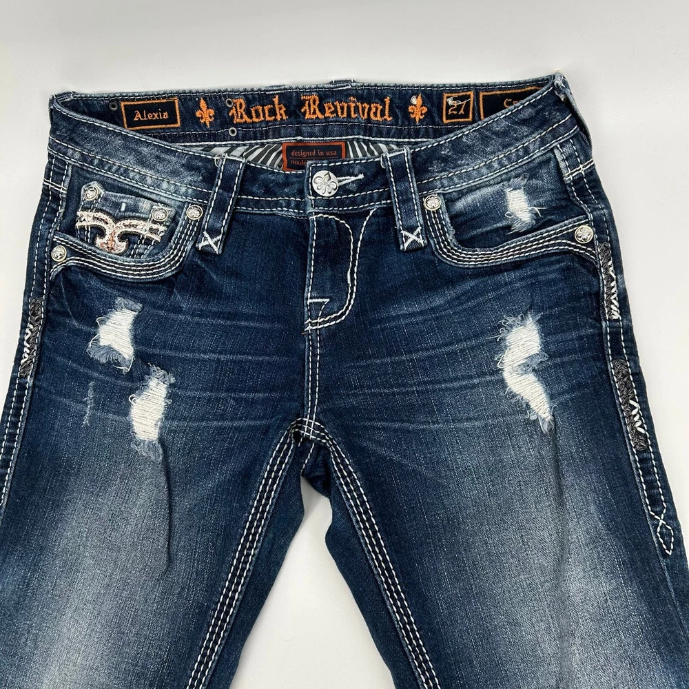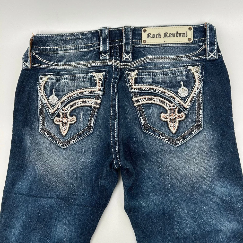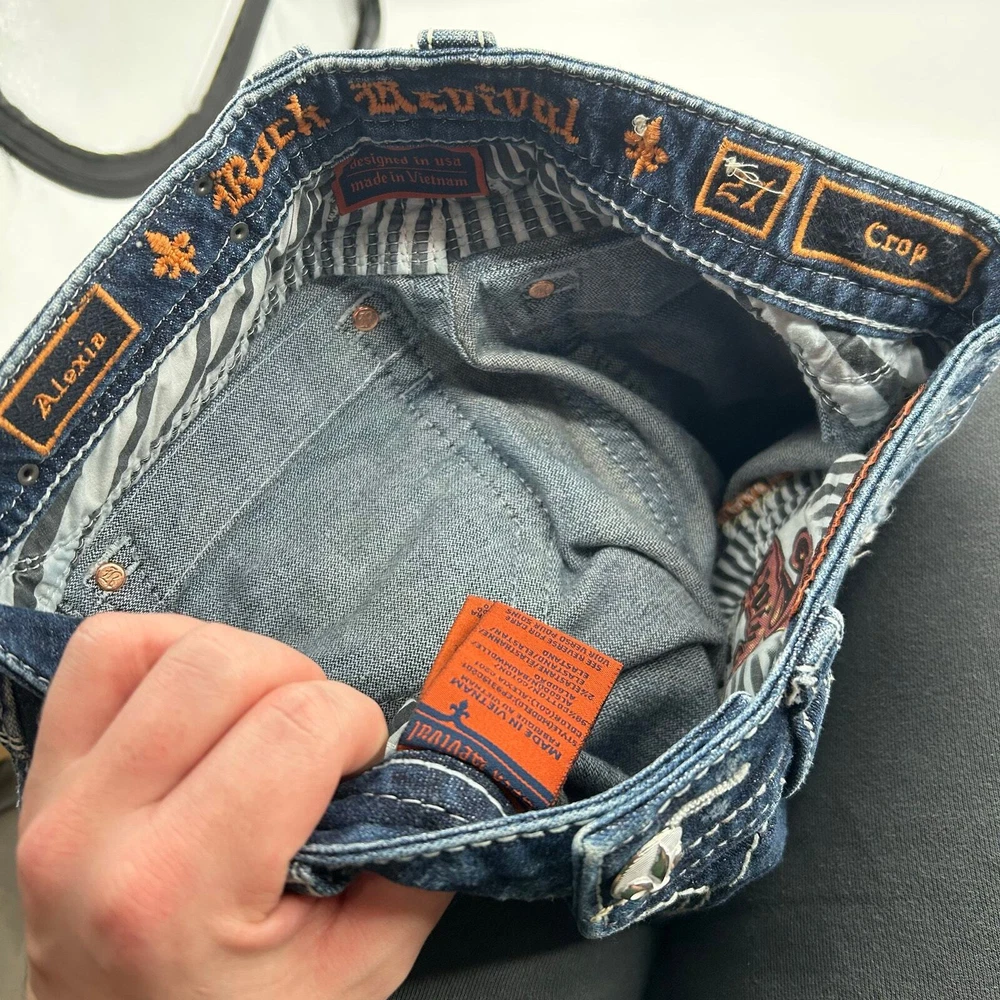 Vintage y2k women's Rock Revival Alexia Capris Cropped blue medium dark wash denim jeans -pink, orange, embroidered, cross, floral, distressed Waist: 30" Inseam: 21" Hip: 35" Rise: 8" Leg Opening: 7" Tag Size: 27 *the waist got stretched out a bit, but the hips didn't, so please keep that in mind. It would be best to stay true to your size and wear a belt, since the hips didn't stretch too. Item is in good used condition. Look at photos to see the condition. All, if any, flaws have been pictured. See the last photo for measurements. The waist and hip measurements are measured flat and then multiplied by 2 to get the full measurement around. Please know which measurements fit you prior to purchasing, and don’t just rely on the size tag. Feel free to ask any questions! ***Item is cross posted on several platforms***