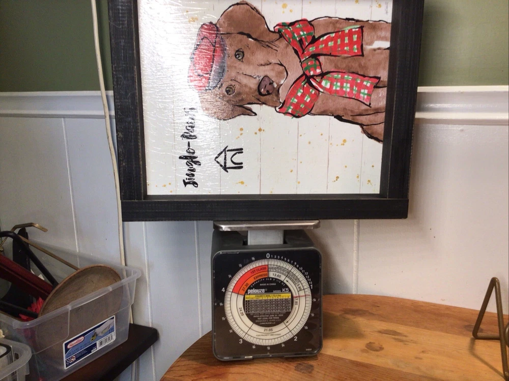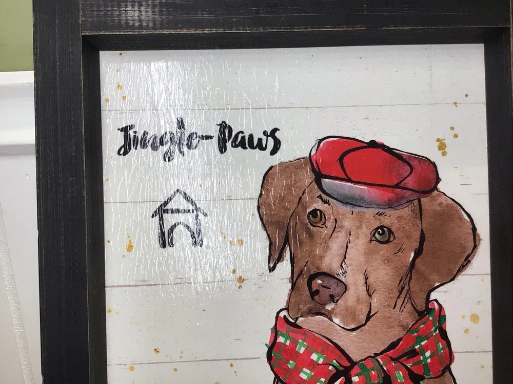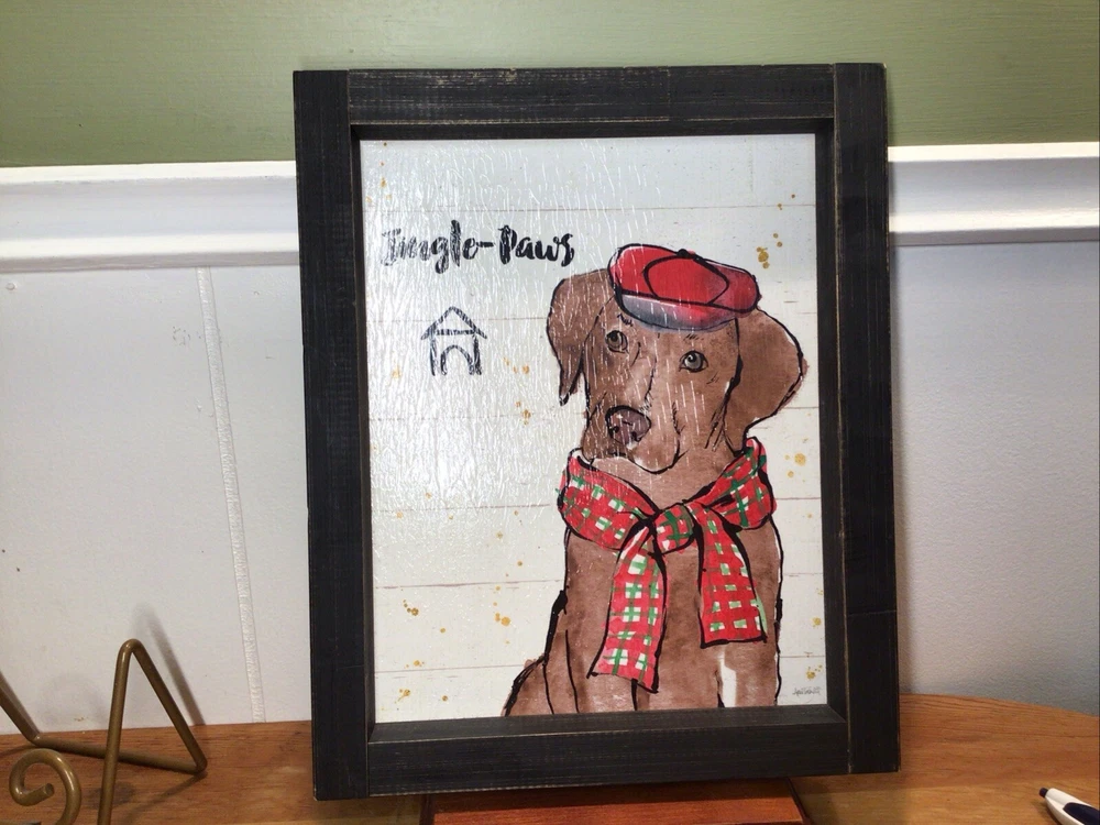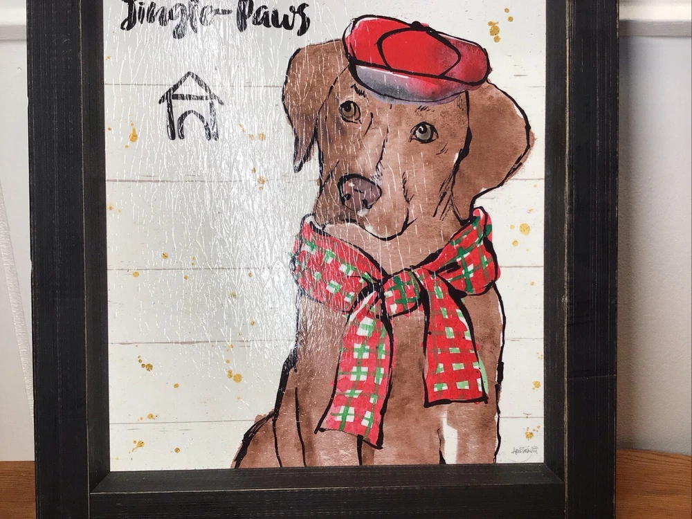 Bring home the charm of this modern rustic Christmas Jingle by Anne Tavoletti. This canvas wall art features a chocolate lab character named Strike a Paws and is perfect for any room in your home. Measuring 9.25 inches in length, 11 inches in height, and 2 inches in width, this medium-sized print is ready to hang and comes with a decorative touch. The print is signed by the artist and is a reproduction of the original. It is made of wood material and weighs 1.25 lbs. The item does not require any additional parts and is suitable for teens, adults, and kids. The Christmas JinglePaws product line adds a festive touch to your home décor. - ready to hang,. - chocolate lab in a red hat and plaid scarf