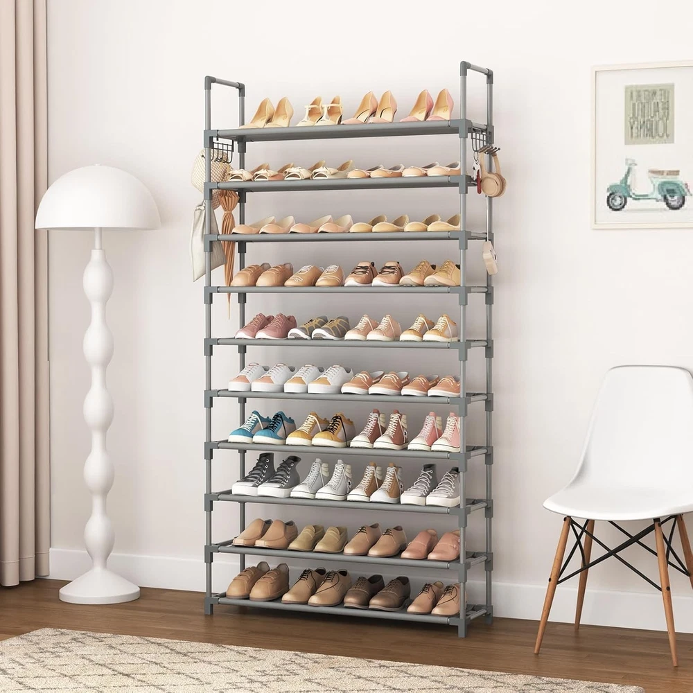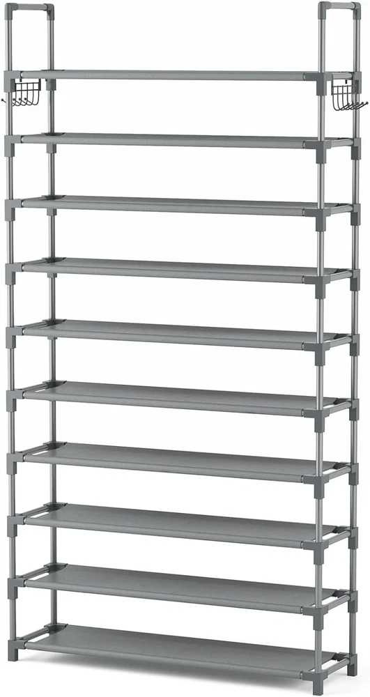 VTRIN 10 Tiers Shoe Rack Tall Large Capacity 50 Pairs Wide 10-1 Tier Grey Product Details Room Type: Bedroom Number of Shelves: 10 Special Feature: Portable, Space Saving, Rust Proof, Weather Resistant, Durable Product Dimensions: 10"D x 34"W x 68"H Style: Modern Age Range (Description): Adult Brand: VTRIN Size: 10-1 Tier Grey Assembly Required: Yes Recommended Uses For Product: shoes,clothes,bags, toys, towels, sundries, books, plants, keys, umbrellas, and small accessories Number of Items: 1 Manufacturer: VTRIN Included Components: Hammer, Hook, Non-woven fabric, instruction manul, Metal pole Model Name: XJ-119 Item Weight: 5.5 Pounds Furniture Finish: Natural/Unfinished Installation Type: Freestanding Min. Required Door Width: 34 Inches Unit Count: 10.0 Count Item Weight: 5.5 pounds Item model number: XJ-119 MaterialMounting Type: Non-woven fabric, Plastic, MetalFloor Mount and DIY Shelf TypeShape: Tiered ShelfRectangular 【Large Capacity 10 Tier Wide Shoe Rack】The 10 tier shoe organizer can store up to 50 pairs of adult shoes, and you can remove one layer to fit long boots. This shoe organizer is not only suitable for shoes, but also for bags, sundries, books, plants. Shoe storage with 10 hooks, you can hang keys, umbrellas, bags, etc., very practical design. There are anti-fall handrails on the top for more secure placement of items. 【Sturdy Material & Compact Structure】The shoe rack tall is made of durable waterproof non-woven fabric layers, reinforced plastic connectors and thickened iron pipes, good stability and prevents rust, The shoe rack organizer has the characteristics of firmness, stability, and long life. The shoe rack organizer for closet can hold larger and heavier shoes or objects. 【High-quality Entrance Shoe Rack】Dimensions of shoe storage: 34"L x 10"W x68"H, simple and elegant appearance. The 50 pairs shoe racks can help you better save space and neatly store a large number of shoes. It is not only suitable for placing shoes, but also for placing books and sundries. It is very suitable for people who like to buy shoes, have many children, and have a big family. 10 tiers tall shoe rack is perfect for closets, entryways, dorm rooms, apartments, hallways. 【Easy to Assemble】Use the included small wooden hammer to tap the joints to make the 10 tall tiers shoe rack large capacity 50 pairs wide shoe organizer tighter and stronger, which brings you great convenience, easy assembly by one person. Hold the shoes of all family members and keep them organized, you can also split into 5 tier shoe racks 2 units. 【Worry-Free Service】Any quality problems and problems with our VTRIN 10 tier shoe rack for entryway after purchase, please feel free to contact our after-sales service.