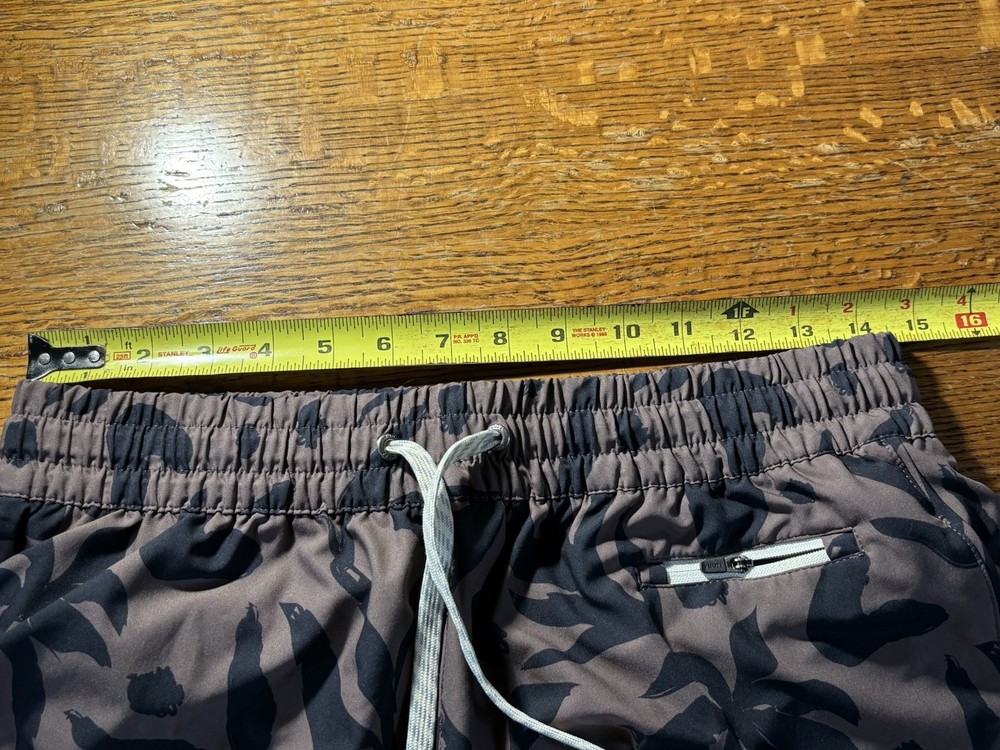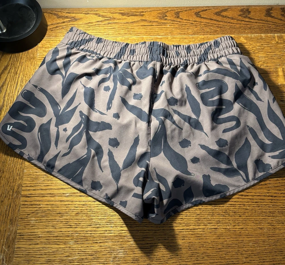 The VUORI Clementine 2.0 Shorts in Women's size L are stylish brown camo athletic shorts with a regular fit and 2.5" inseam. Made from a polyester blend fabric with a lined interior, these shorts feature a drawstring closure, elastic waist, and pockets for added convenience. Perfect for various outdoor sports activities and casual wear, these machine washable shorts are a versatile addition to any woman's wardrobe, reflecting the brand's focus on performance and comfort in athletic clothing.