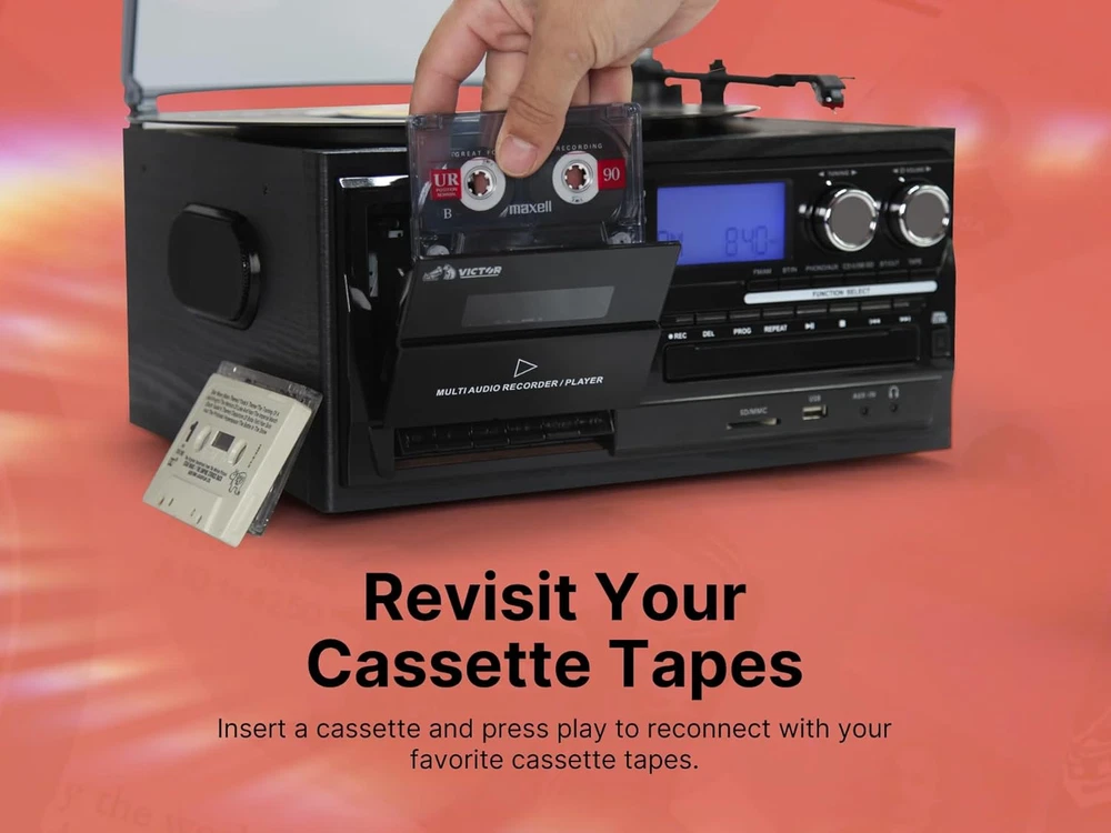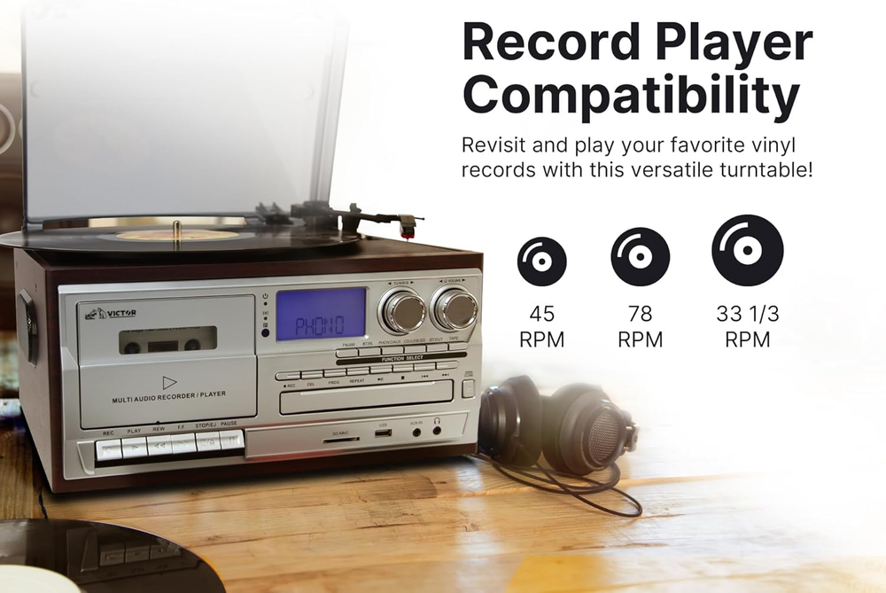 Store New Arrivals Add to Favorite View Feedback Contact VWRP-4200 Cosmopolitan 8-In-1 Turntable Music Center with 3-Speed Record Player, Cd/Mp3/Cassette Player, AM/FM Radio, Dual Bluetooth in & Out, USB Playback & Recording Description Item model number VWRP-4200-BK Style retro Maximum Rotational Speed 78 RPM Color Black Product Dimensions 12.8 x 7.9 x 11.6 inches Material Wood, Plastic Country of Origin China Item Weight 7.1 Pounds Connectivity Technology Bluetooth Model Name Cosmopolitan Special Feature USB Port Included Components UL Approved Adaptor, Remote Control, User Manual, Quick Set Up Guide 8-IN-1 MUSIC CENTER FOR ALL-IN-ONE LISTENING -- The Victor VWRP-4200 Cosmopolitan combines a 3-speed turntable, CD/MP3 player, cassette player, AM/FM radio, dual Bluetooth in & out, USB playback & recording, and built-in stereo speakers, offering a complete music experience. 3-SPEED RECORD PLAYER FOR VINYL FANS -- Play your vinyl records with the built-in 3-speed turntable, supporting 33 1/3, 45, and 78 RPM formats. Whether you enjoy modern LPs or vintage records, this system has you covered. CD/MP3 AND CASSETTE PLAYERS FOR RETRO PLAYBACK -- Enjoy your favorite CDs, MP3s, and cassette tapes with built-in CD and cassette players, allowing you to listen to your entire music collection, from analog to digital formats. DUAL BLUETOOTH IN & OUT FOR FLEXIBLE STREAMING -- With dual Bluetooth capabilities, stream music wirelessly from your smartphone or tablet, or transmit music from the turntable to Bluetooth headphones or speakers for added convenience. USB PLAYBACK AND RECORDING FOR DIGITAL MUSIC -- Play digital music files from a USB flash drive or record your vinyl, CDs, and cassettes directly to digital format with the USB recording feature, preserving your favorite tunes. AM/FM RADIO FOR CLASSIC BROADCAST LISTENING -- Tune in to your favorite AM/FM radio stations, offering access to news, music, and talk shows through this all-in-one system. BUILT-IN STEREO SPEAKERS FOR HIGH-QUALITY SOUND -- The VWRP-4200 features built-in stereo speakers, providing rich, clear audio without the need for additional speakers, making it a convenient all-in-one solution. RETRO-INSPIRED DESIGN WITH MODERN FUNCTIONALITY -- With its vintage-inspired design, the Cosmopolitan adds a stylish touch to any room while offering modern features like Bluetooth and USB recording for a complete listening experience. HINGED DUST COVER -- Included to protect your Device and Vinyl during Playback and Storage." Product Description 1 Vinyl Records 2 CD's 3 Cassettes 1 Stereo Sound 2 Bluetooth Out 3 Input 1 All-In-One 2 Style 3 For Any Space Product Dimensions Product Specifications Turntable Speed: 33/45/78 RPM Bluetooth Version: 5.0 Inputs: Aux In, USB, SD Memory Card Output: Line Out Power Source: AC 100-240V Accessories Included: ETL Approved Power Adaptor, Remote Control, User Manual ABOUT US We offer the best prices around on high quality products. Our E-store includes media such as books, movies, music and games while offering electronics, toys, sporting apparel, clothing, tools, general home, garden items and more. SHIPPING We are always working hard to ensure your package arrives as soon as possible. Please understand that some factors like weather, high postal traffic, and the performance of shipping companies are outside of our control. We offer free shipping to the lower 48 states and ship within 2 business days of payment, usually sooner. We do not accept P.O. Boxes. Please provide a physical address. For shipping outside of the continental USA, we only use eBay's Global Shipping Program.The item is shipped to KY and then sent to the rest of the world. International customers are responsible for all duties and taxes. Continue to check out in order to calculate costs for shipping the item to your country. Messages regarding eBay's Global Shipping Program MUST be directed at eBay EXCLUSIVELY. RETURNS We offer a 30-Day Return Policy on items which you are not completely satisfied with. You have the option for a full-refund or an exchange of the item. No returns are available on items shipped outside of the USA. PAYMENT We accept PayPal. CONTACT US This page content is yet to come Please ad us to your favorite seller and visit again later Thank You CUSTOMER SATISFACTION We try our very best to make sure every customer is completely satisfied. If there's a problem, message us! We're happy to help. WE ACCEPT Copyright © 2021 AutoDS. | All Rights Reserved