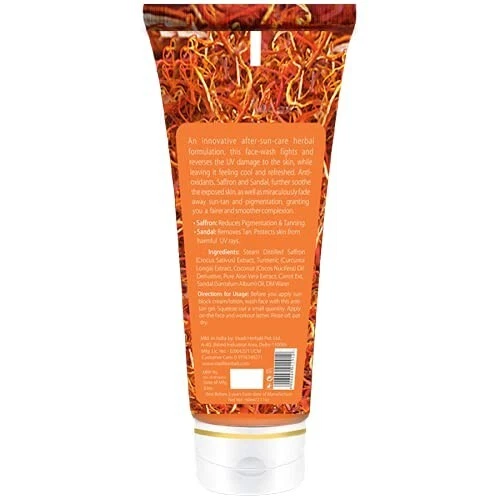 Product description An innovative aftersuncare herbal formulation, this facewash fights and reverses the UV damage to the skin, while leaving it feeling cool and refreshed. Antioxidants, saffron and sandal, further soothe the exposed skin, as well as miraculously fade away suntan and pigmentation, granting you a fairer and smoother complexion.What is sun tan and how does Saffron-Sandal combo help in fighting it off? The human body has its own mechanism of protecting itself from external factors that harm it. When the UVA and UVB rays from the sun attack, the skin produces Melanin in the epidermal layer of the skin. Melanin acts as a protective shield against the sun's harmful effects. The skin, as a result, darkens in color. This is called sun tan. Sun tanning over period of time leads to a dull, lack-luster skin with blemishes and black spots on the tanned areas. A sun block helps in keeping a tab on the tanning process, saving the skin from damage.What is the role of Saffron in providing a perfect sun protection and aid healing?Mainly found Iran and also cultivated in Kashmir, Spain and Greece, Crocus sativus or simply Saffron is known for it's soothing and medicinal properties. Saffron facilitates deep pore exfoliation which yields a clearer, fresh and flawless skin with regular use. Scars, sun spots, dark patches and blemishes fade quickly as saffron acts under the skin's epidermal layer, healing and rejuvenating the skin from within and imparting a healthy glow on the outside. Toning the skin, curing burns, rashes and allergies, Saffron safeguards the skin from further damage by acting as a shield. When combined with Sandal, Saffron moistens the skin to prevent dryness and itching thereby enhancing the texture. How is Sandal beneficial for the skin?Sandal extracts are taken from Santalum trees which are found in the Indian Sub-continent, Indonesia, Australia and Pacific Islands. Sandal is a skin toner, which heals sun-burnt skin in no time. It even tones the skin in a subtle way and imparts a glow, fading away pigmentation, scars and patches. A natural astringent, Sandal is germicidal in nature. It prevents the action of bacteria which may further harm the sun-damaged skin. Being an excellent antiseptic, Sandal has a cooling effect which cures rashes, burns, reduces tan and eruptions.Far above any naturally occurring moisturizer, Sandal seeps down the layers of the skin, soothing and moisturizing the skin in a way that it makes the skin soft, supple & improves the skin texture. From the manufacturer Benefits of using Saffron Face Wash 1. Fights and reverse the UV damage to the skin. 2. Fades away dark spots and pigmentation. 3. Grants fairer and smoother skin. VAADI HERBALS SAFFRON FACE WASH An innovative after-sun-care herbal formulation, this face wash grants you a fairer and smoother complexion. An innovative after-sun-care herbal formulation, this face-wash fights and reverses the UV damage to the skin, while leaving it feeling cool and refreshed. Anti-oxidants, Saffron and Sandal, further soothe the exposed skin, as well as miraculously fade away sun-tan and pigmentation, granting you a fairer and smoother complexion. Premium saffron and sandal rich facial cleanser. Suitable for all skin types, be it oily, normal or dry. 100% herbal with no added preservatives and chemicals. Formulated to help skin look beautiful and healthy. KEY INGREDIENTS Saffron Extract Saffron is also popular as a complexion lightening and smoothening agent due to its ability to lighten acne scars and tanned, pigmented or blemished skin, and even out and moisturize dry skin. Sandalwood Known since ages as a natural complexion enhancer, Sandal is also a great anti microbial which not only treats acne breakouts and blackheads, but also works as an antiseptic. Additionally, it helps lighten and largely remove blemishes, acne marks and dark spots. Turmeric Turmeric has been used as an antiseptic for centuries and it is regarded as one of nature's most powerful healers. The herb helps to even out your skin tone and colour, making it an excellent ingredient in a face wash. HOW TO USE Before You Apply Sun Block Cream/Lotion, Wash Face With This Anti-Tan Gel. Squeeze Out A Small Quantity. Apply On The Face And Workout Lather. Rinse Off, Pat Dry.