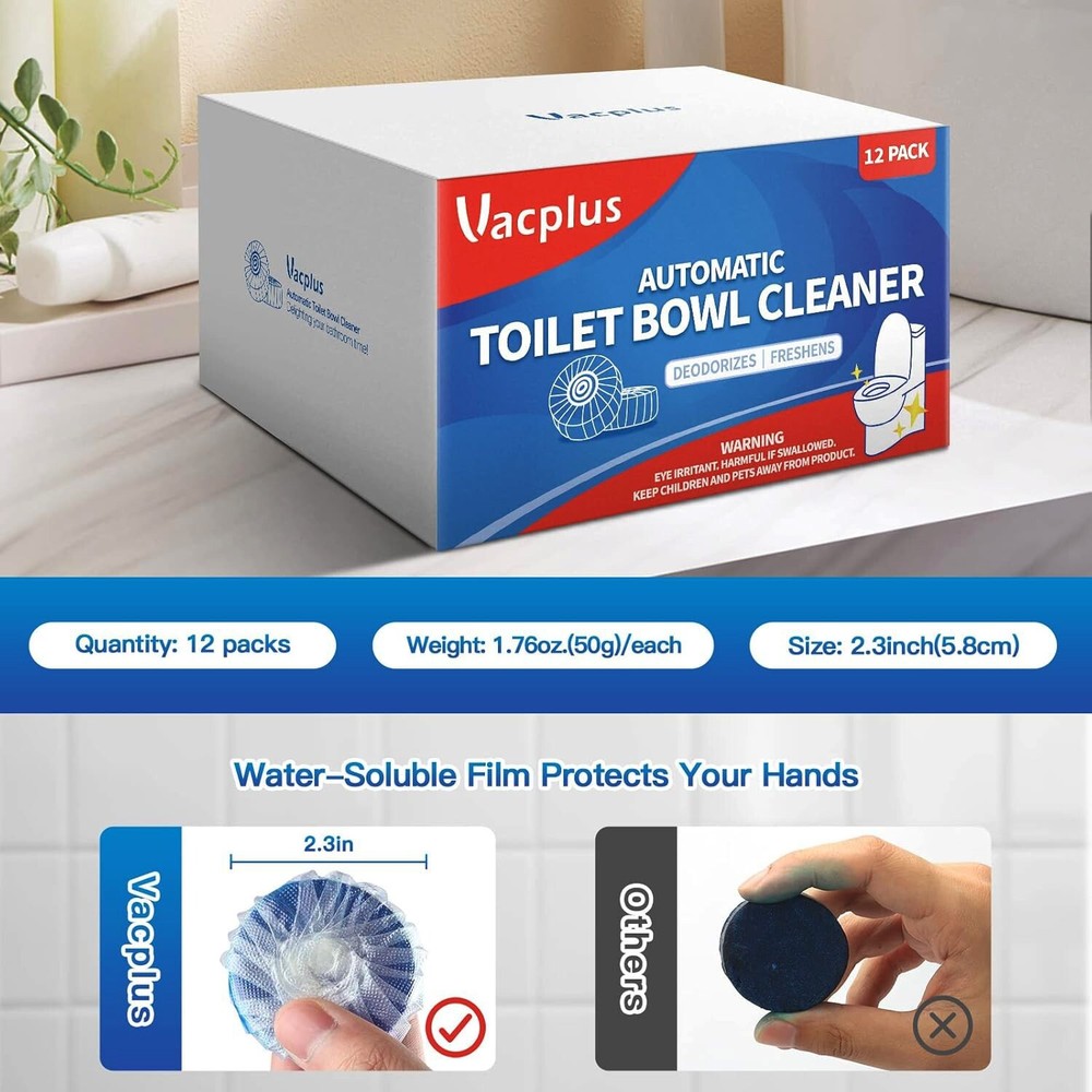 Vacplus Automatic Toilet Bowl Cleaner Tablets (12 Pack) – VA-T165 With Fast And Free Delivery All Over in USA Keep your toilet fresh and stain-free with Vacplus Automatic Toilet Bowl Cleaner Tablets . Designed for effortless cleaning, these powerful tablets dissolve slowly in your toilet tank, releasing effective cleaning agents that work with every flush. They help prevent limescale, hard water stains, and toilet rings while keeping your bathroom smelling fresh. Key Features: ✔ Automatic Cleaning – Works continuously with each flush to maintain a clean toilet bowl. ✔ Stain & Buildup Prevention – Helps prevent hard water stains, limescale, and mineral deposits. ✔ Long-Lasting Freshness – Each tablet lasts up to two weeks, ensuring continuous cleaning. ✔ Easy to Use – Simply drop a tablet into the toilet tank—no scrubbing needed! ✔ 12-Pack Value – Provides long-term toilet maintenance and cleanliness. How to Use: Remove a tablet from the packaging. Drop it directly into the toilet tank (away from the flush valve). Allow the tablet to dissolve gradually, releasing cleaning agents with every flush. Replace with a new tablet when the previous one is fully dissolved. From the Manufacture: Previous page