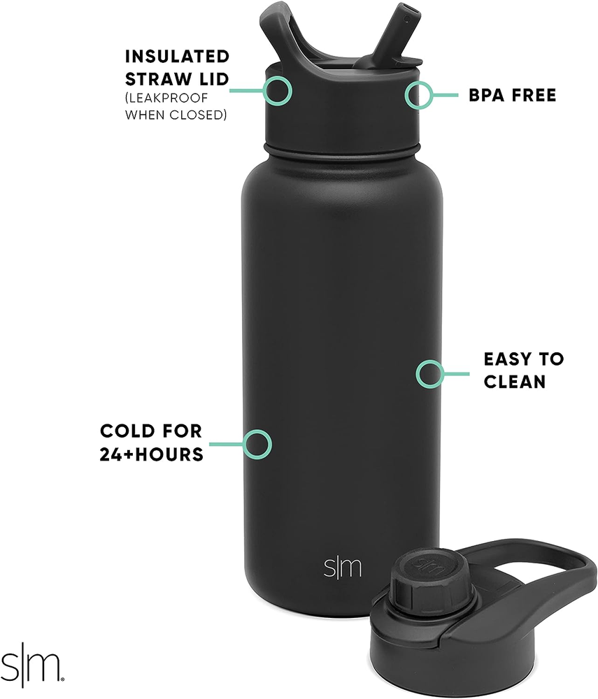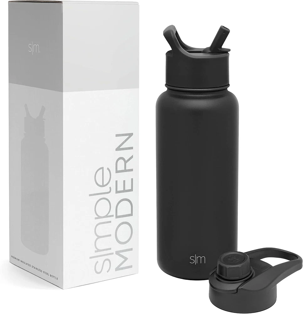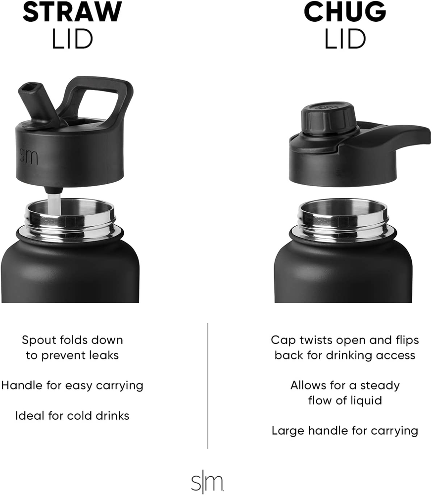 Double Wall Insulation: Keeps beverages at ideal temperatures for hours BPA-Free: Comes with a BPA-free Straw Lid and Chug Lid that is dishwasher safe on the top rack Leakproof: Offers a tight seal to prevent spills and leaks; Not recommended for hot or carbonated beverages Personalize: 32oz Summit inlcudes straw and chug lid for drinking preference Limited Lifetime Warranty & Patent Pending The Simple Modern Summit Water Bottle with Straw Lid and Chug lid comes with two different lid options to best fit your daily needs. The Straw Lid and Chug lids are both leak-proof and have a transport handle to keep you hydrated on the go. The bottle is made from double walled, vacuum insulated 18/8 stainless steel.