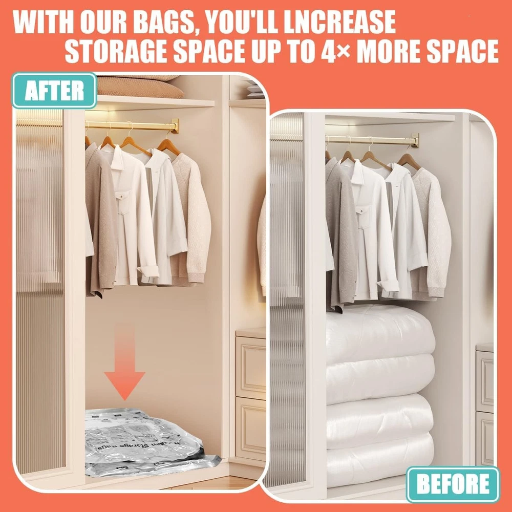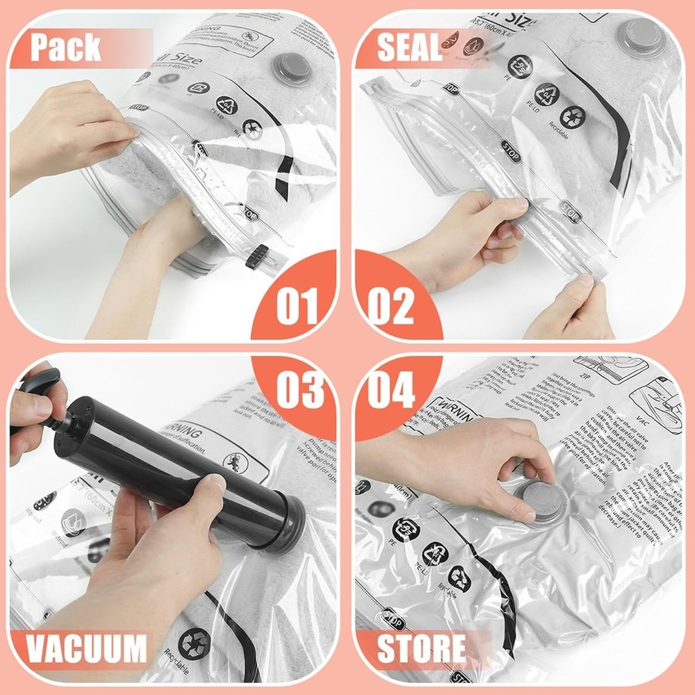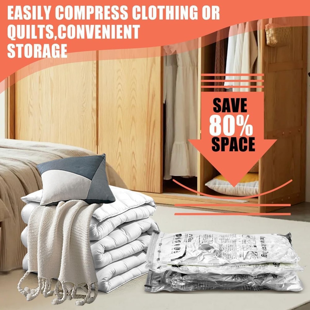 Free eBay listing template designed by dewiso.com Vacuum Storage Bags, Space Saver Bags, Compression for Comforters and Blankets, Sealer Clothes Storage with Hand Pump. (6× Medium) FREE AND FAST SHIPPING! About this item PA+PE 【80% Space Save】Our vacuum bags add more room to your clothes storage & wardrobe, lofts & suitcase Reduce original volume by 80%. Our vacuum sealer bags can be used for a variety of items including clothes, comforters, pillows, duvet, beddings, etc. 【High Quality】Our vacuum storage bags are made of PA+PE, flexible and durable. our vacuum bags get the air out in the suction process. 【Unique Design】Adopting a unique double zip seal design, with the triple-seal turbo valve, Can be used repeatedly. 【Easy To Use & Store】The one-way valve can adapt the vacuum cleaner, you can easily suck the air out and get the compression done fast and easy. Also, the package comes with a hand pump which is portable for travel. 【Pack Included】6 × medium compression bags( 27.56” X 19.68”), 1× hand pump. Product We offer a 30-Day Return Policy on items which you are not completely satisfied with. You have the option for a full-refund or an exchange of the item. No returns are available on items shipped outside of the US . Shipping We offer Free Shipping to the US and ship within 2 business days of payment, usually sooner. We use UPS express shipping. That's why your products are usually delivered within 3 days . Contact We try our very best to make sure every customer is completely satisfied. If there's a problem , message us! We're happy to help. 24/7 live chat available.