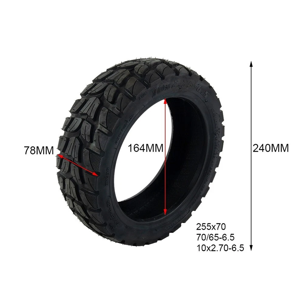Vacuum Tire 70/65-6.5 For Electric Scooter Replacement Rubber Wearproof DESCRIPTION Warn ing: It is illegal to ride electric scooters on public roads, pavements, or cycle paths. They are intended only for use on private land with the owner's permission Description: * brand new and high quality *Made of rubber material, and Wearproof *Not easy to deform, can be use for long time *10x2.75-6.5 tubeless off-road tire, excellent replacement applications that use same tire size Specification: *Material: Rubber *Color: Black *Weight: About 700g *Size:As Pictures Show *Model: 10x2.75-6.5,70/65-6.5,255*70 Package Includes: 1 x Tire Note: 1. The real color of the item may be slightly different from the pictures shown on website caused by many factors such as brightness of your monitor and light brightness. 2. Please allow slight manual measurement deviation for the data. POLICES Shipping Payment WARRANTY We only ship to confirmed ebay Order addresses. Please comfirm that your Order address is in line with your shipping address. Please kindly note that the c ombined shipping is not provided because the shipping fee is calculated by weight. Also, the each additional item means exactly the the same color and size. It takes about 7 -15 working days to US; about 10-30 working days to other countries. Transit time may be a little delayed because of the bad weather and customs inspection . If you do not receive your item within 30 working days since payment finished, please contact us immediately for further assistance. Payment must be completed within 5 days. If you have any problems about payment, please contact us via ebay message. We strive for 100% customer satisfaction! Positive Feedback is very important to us. If you have any questions, p lease feel free to contact us via "Ask seller a question" . We will reply your email within 24 working hours.