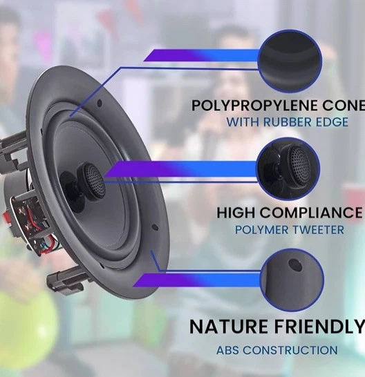 The Vaiyer Set of Two Framed Wall Speakers is a high-end 2.0 channel home theater entertainment system with Dolby Digital surround sound. These 2 compact round speakers have a sleek design, white color, and are made of metal. They have a driver size of 5.25 inches and a total RMS power of 200W. The unit includes audio inputs for Digital Coaxial RCA and Digital Optical TOSLINK, and is compatible with universal brands and models. White Framed Wall Speakers Home Enhance Your Sound Experience: Elevate your audio with our Vaiyer 5.25 Inch Ceiling Speakers, offering versatile installation options for in-wall or in-ceiling use. These 2-way mid bass woofer speakers provide exceptional sound quality. Powerful 175 Watts: Our in-wall speaker system is engineered for peak performance, delivering a robust 175 watts of power. The heavy-duty voice coil ensures impressive sound clarity and extended product lifespan. Sleek Flush Mount Design: With convenient push-type speaker terminals, our speakers are a breeze to install. The seamless flush mount design seamlessly integrates into your space, providing a clean and modern aesthetic. Seamless Integration: Whether you're upgrading your home theater system or customizing your sound experience, our 2-way in-ceiling or in-wall speaker system delivers crisp audio clarity whenever you desire. Easy Installation: We've made installation a cinch with the included 6.9" diameter cut-out template and 3" mounting depth. The product also includes all necessary mounting hardware for precise application.