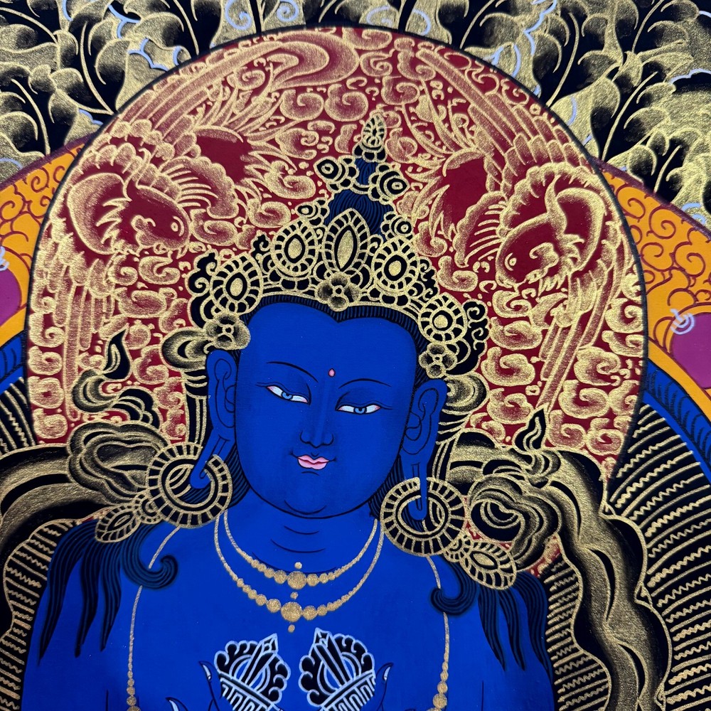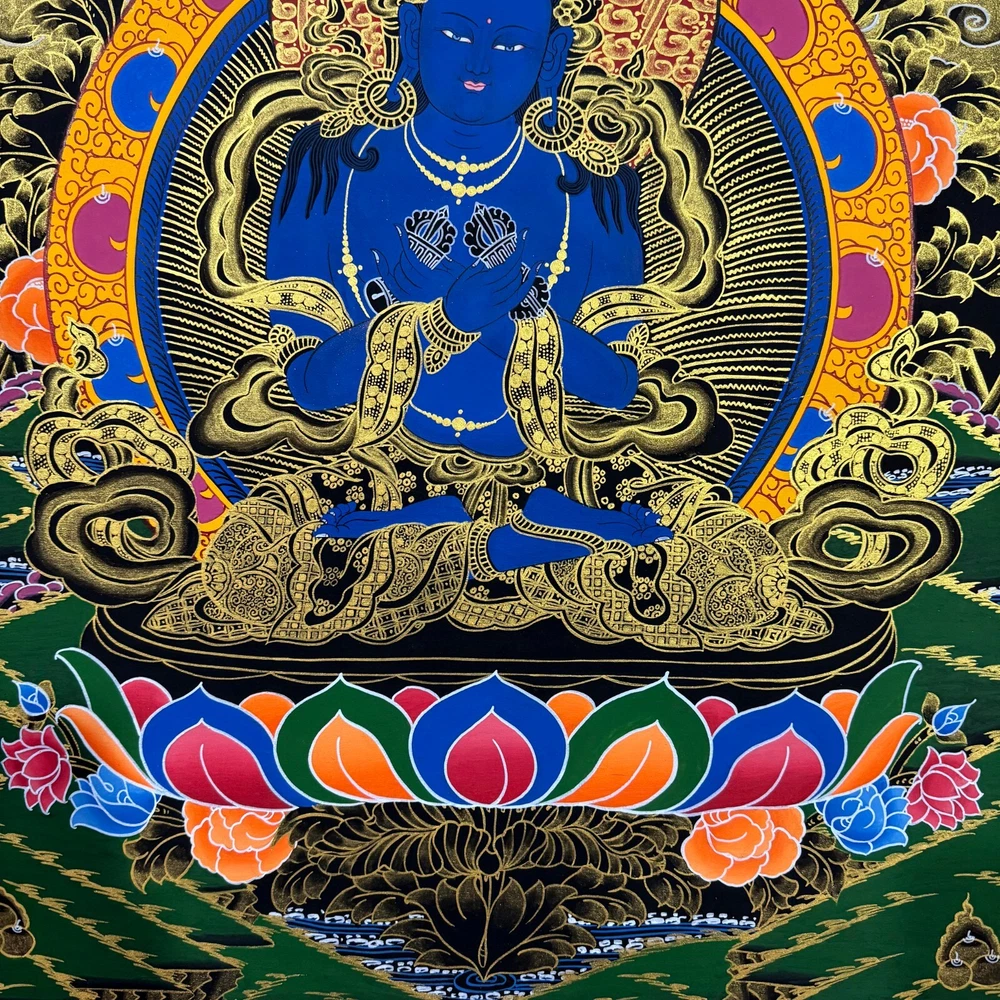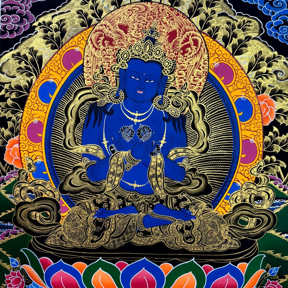 Namaste and Welcome to my Gallery!!! All of the paintings and arts in my gallery are originally handmade and hand-painted by my family members and other local artists who have been practicing their craft for over two decades. My father is Master Artist from Nepal with an experience of more than four decades; you can see some of his work in this Gallery. Also you can see some of the beautiful and soulful artwork of talented local artists from Himalayas. ~~ VajradharaThangka~~ In Vajrayana, Adi Buddha is regarded as the highest deity of the Buddhist Pantheon. When represented, he begets the name of Vajradhara and is conceived in two forms single and Yabyum. When single he is decorated with jewels, ornaments and dresses. He sits in the vajraparyanka or the attitude of meditation. He carries a vajra in the right hand and bell in the left, the two hands being crossed against the chest. [Size = 67cm x 52cm] Material Used: • Cotton Canvas • Natural Pigments and colors • Gold leaf ~Excellent for meditation or home/office decor, ~Tibetan Yoga Wall Art ~Genuine 100% hand-painted from Himalayas Please feel free to contact me if you have any question regarding the painting.