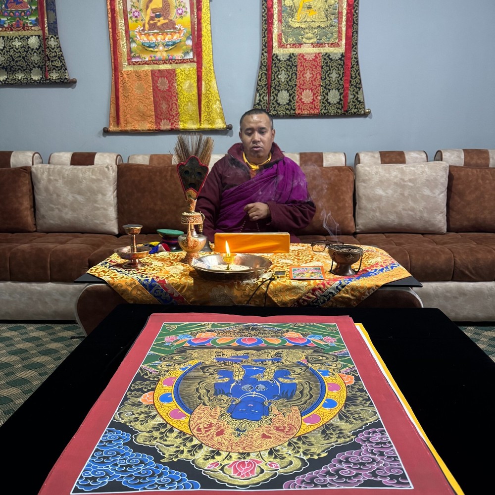 Fast shipping, well packed in hard tubing, and item exactly as described. High value KALACHAKRA MANTRA painted in high quality pigment and water drop gold. Beautiful high-quality brocade framed for a thangka.
