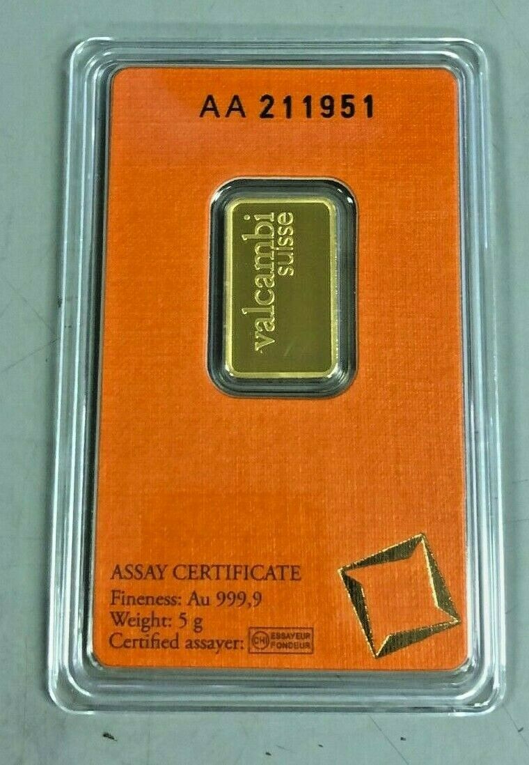 ITEM: Gold 5 gram Valcambi Bullion Bar QTY: 1 WEIGHT: Each Bar is 5 grams PURITY: .9999 fine Gold Type: Bar in Plastic Assay Car MINT: Valcambi Suisse 1 - Gold Valcambi 5 gram Bullion Bar in Assay Card Customers will receive 1 Gold Valcambi Mint 5 Gram Bar in Plastic Assay Card. Each bar has its own individual serial number. Payments Sales Tax: Please refer to eBay state sales tax requirements page for taxes. Since supreme court decision (Wayfair vs south Dakota) eBay now handles all sales tax for eBay transactions. Payment Due: Payment is due immediately International Buyers We do not accept Payment from International Buyers. All eBay buyer Accounts with International usernames will have the order cancelled. Shipping Free Shippin g: We offer free shipping through UPS and USPS Shipping Method: Free standard shipping. Orders over $700 will ship UPS Ground with Signature Confirmation. NO PO BOX OR POST OFFICE DELIVERY. Contact Us Hours - Weekdays: We are available 6:30 am to 4:00 PM PST Monday to Friday Hours - Nights & Weekends: We try our best to reach each customer in a timely manner. We return all eBay messages in less than 24hrs.