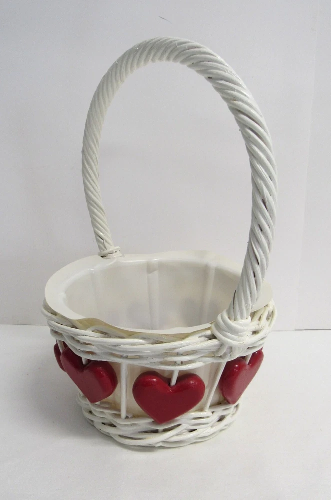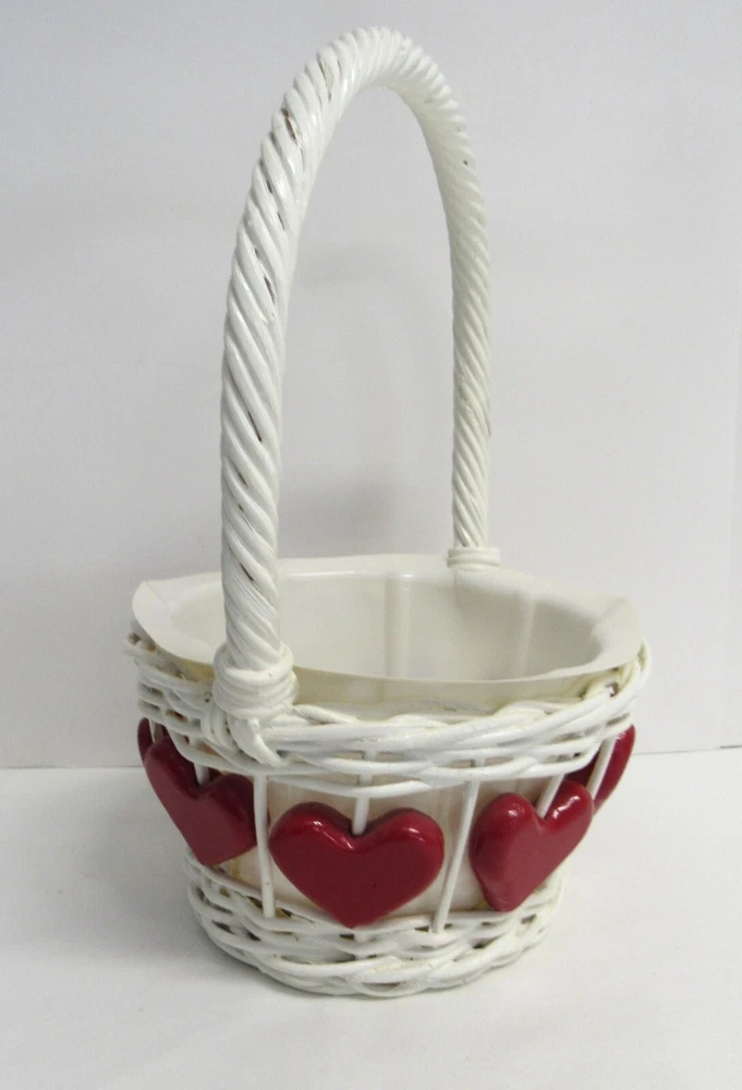 Valentine Hearts Wicker Planter Basket - 10 inches, with Liner - EUC. Red Hearts surround a Wicker Basket for your Holiday Pleasure. This basket is 6 inches wide (7 1/4 with handle) and 4 inches high (10 inches with handle). Excellent Used Condition, minor marks may exist from use and age. This will make an excellent addition to any Valentine collection. Ships via USPS Ground Advantage for a flat amount. - Please review all pictures as these are part of the description of this item - Please pay for item within three days of purchase - Feedback is highly appreciated - Message me with any questions before purchase