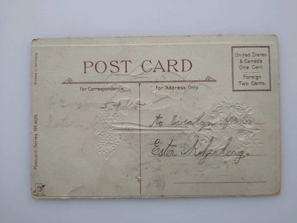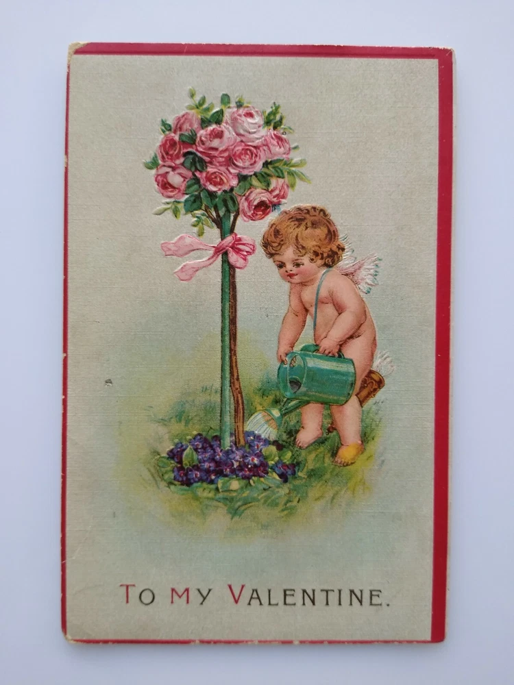 Valentine Postcard Cupid Gardening Plants Pink Roses Gabriel Series 408 Germany Antique vintage original embossed postcard. Has corner creases, rounding, and age wear. Red border is off set. Gabriel logo and series 408 on back. Writing on back but non posted. Stock# va21. Additional vintage Halloween, Santa, Christmas, holiday postcards, are in our store. SHIPPING Bundle and save by using cart and making single payment. International buyers are responsible for any import fees/taxes. ABOUT US Seller of vintage ephemera, collectibles, retro gifts, advertising, artwork, vinyl records, pinball and arcade game flyers and parts, Mad magazines, antique Halloween & holiday postcards, Christmas items, super hero memorabilia, horror themed art, fun stuff. Any questions about this item please just ask.