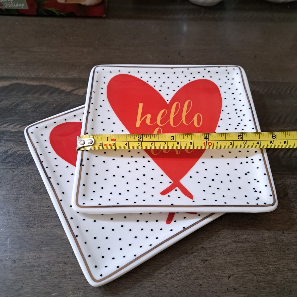The Valentine Snack Plates Set of 2 features a romantic design with a red heart and the phrase "Hello Love", making it perfect for a Valentine's Day celebration. Made of porcelain, these 5.75"x5.75" plates are easy to care for and clean with a damp cloth amd warm water. The red and white color scheme adds a festive touch to any table setting, making them a charming addition to your holiday decor.