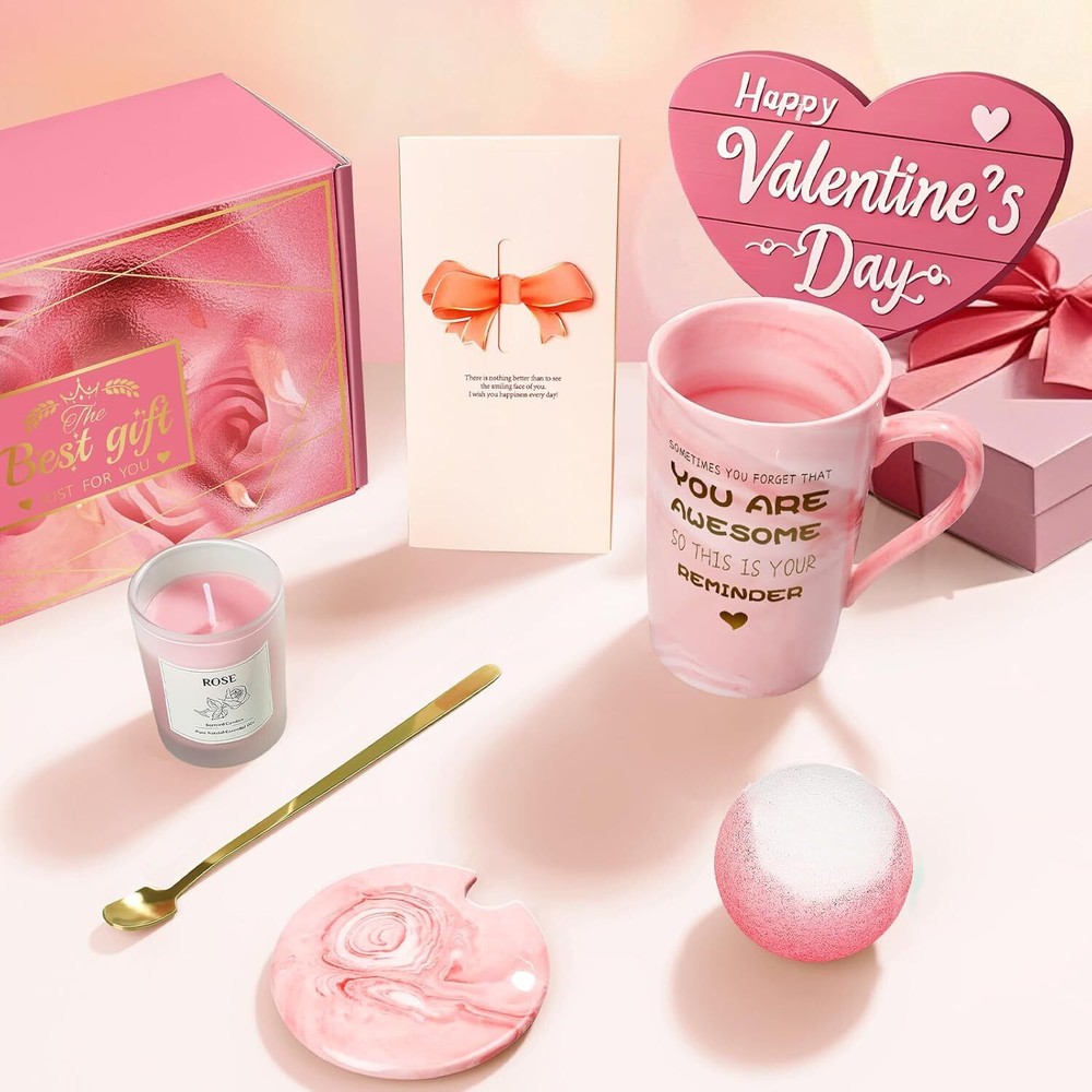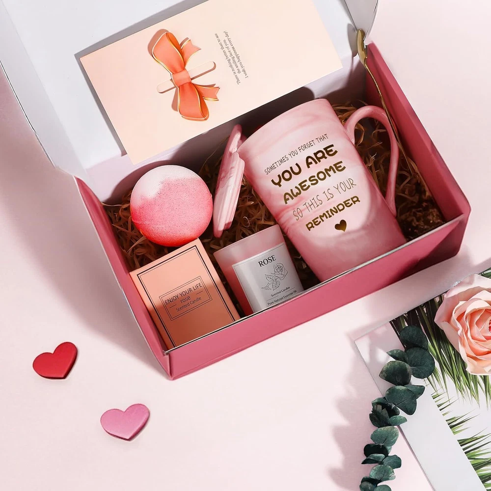 Valentines Day Gifts for Her Rose Spa Gift Baskets for Women About This Item: Elegant Gift Box – Perfect for all occasions. Luxury Set – Mug, scented candle, bath bomb, greeting card. Personal Touch – "YOU ARE AWESOME" mug. Relaxation & Self-Care – Spa-like experience at home. Ready to Gift – No extra packaging needed. Ideal Gift – Perfect for birthdays, anniversaries, Christmas, and Valentine’s Day. For Her – Great for moms, wives, sisters, girlfriends, and best friends. Luxury Set – Includes a mug, scented candle, bath bomb, and greeting card. Heartfelt Message – “YOU ARE AWESOME” mug for a personal touch. Spa Experience – Relaxing aroma and pampering essentials. Gift-Ready – Elegant packaging, no wrapping needed. A luxurious and thoughtful gift for your special women in your life An exquisite and timeless gift adorned in a charming pink theme - Eletorot has meticulously crafted every intricate detail, ensuring to delight and impress all who receive it! Relaxation and Self-Care Indulge in exquisite, one-of-a-kind gift baskets tailored to delight – featuring premium bath bombs and fragrant candles, inviting you to effortlessly immerse yourself in a luxurious at-home spa experience. Perfect as self-care treats or relaxing gifts for women, these baskets embody pampering and rejuvenation. Heartwarming Coffee Mug Set We've accentuated the mug with sumptuous golden lettering, embossing the heartfelt message, "YOU ARE AWESOME," to serve as a daily reminder of her invaluable worth and significance. It's a considerate and soul-warming gift, tailored to elevate her spirits. Ideal Gift baskets For Any Occasion Whether it's a Valentine's Day, birthday, Thanksgiving, Christmas, anniversary, Mother's Day or any other occasion, our luxury spa gift set are sure to give her a great surprise and make her smile on her special day. Birthday Gifts For Women Elegantly wrapped and thoughtfully chosen, each gift ready to give. Add your personal touch to the card and send with joy, ready to see her delighted smile.