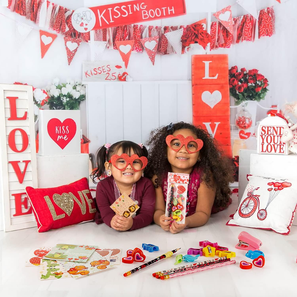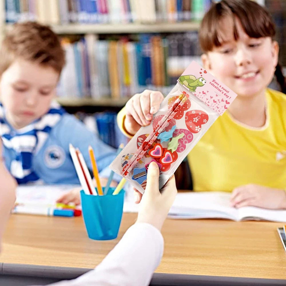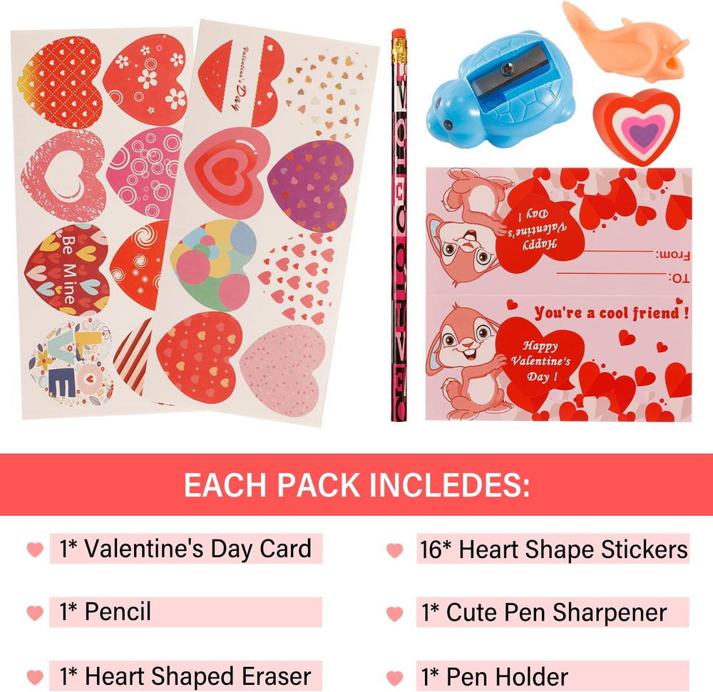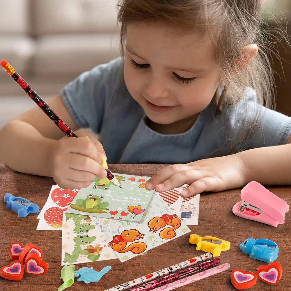 šSuper value kids valentines gifts set - 28 Packs, 590 PCS IN TOTAL! Each Pack of Valentineās Stationery includes 16 Patterns Valentine's heart stickers, 1 Valentineās pencil, 1 Valentine's card, 1 big red heart-shaped eraser, 1 pen sharpener, 1 pen holder! Besides, the package comes with a pink stapler and a box of staples, you could pack a great gift set by own. šSuper Good Quality Safe for Kids: All accessories included are made with premium BPA-free material, useful and durable. Cute heart shape erasers and colorful-printed pencils can be stationery for kids' daily school study. šCute Valentines Day Cards for Kids - This 28 pack of V-day Cards allows you to pick your favorite animal patterns design for your favorite person in the classroom. Comes with a 28 pack Valentine's gifts set, all you need is a pen to fill out a sweet message. šExtra Bonus - There are 28 pen holders in the package, which helps correct the child's pen holding posture. Surprise your friends by sending out such a unique Valentine's gift! šPerfect Valentines Cards Gifts for Kids classroom - There's no denying that love should be equally expressed on Valentine's Day. These Kids Valentine cards pencils sets are perfect for school valentines! Product Description With or without flowers and chocolate, cards are the perfect way to show your partner how much they mean to you with a touching message that will become a keepsake for years to come. Want to avoid a handmade card fail? Dreading the thought of helping your child write the names of all twenty classmates on those tiny Valentines? Looking for a way to get creative with your kid's Valentines without subjecting yourself to hot glue burns? Alternatively ā go for something funny. We've got you covered. 28 Packs Valentineās Day Cards Gift Sets For Kids - Will Be a Popular Hit In Any Classroom! WOW! Super Cute Kids Valentines Day Cards Stationery Set Comes in Pack! ļ·So you can easily send a card to all of your family members and friends. ļ·If your little sweetie pie is obsessed with hearts ā specifically Valentines stickers and pencils ā this valentines gifts pack will get some serious giggles. 28 Pack of Valentine Favors for Kids - 590 PCS in Total, 21PCS for Each Pack! 28 Kids Valentines days cardsļ¼28 PCSļ¼ 28 Valentines-themed pencilsļ¼28 PCSļ¼ 28 Set hearts erasers (28 PCS) 28 Pen sharpeners (28 PCS) 28pcs Pen Holders (28 PCS) 28 Pack * 16 Valentines stickers ( 448 PCS) 1 Stapling Machine (1 PCS) 1 Box of Staples (1 PCS) Write it Down and Send It Out! In Valentine's Days past, you once dutifully crafted hundreds of handmade cards as a student in school. Making and sharing Valentine's Day cards is still a cherished tradition. Kids will have a fun time with these Valentines cards and pencils set at school, handing them out to friends and crushes. All you need is a pen to fill out a sweet message! You donāt have to stop with just your sweetheart. Moms, dads, sister, kids, grandparents, nieces and nephews. Everyone appreciates a sweet card, especially if itās unexpected. Instead of just giving a plain card, your kids can give a whole lot of fun to their friends and classmates. This Valentineās gifts Set is fun for kids and also works well accompanying a present.