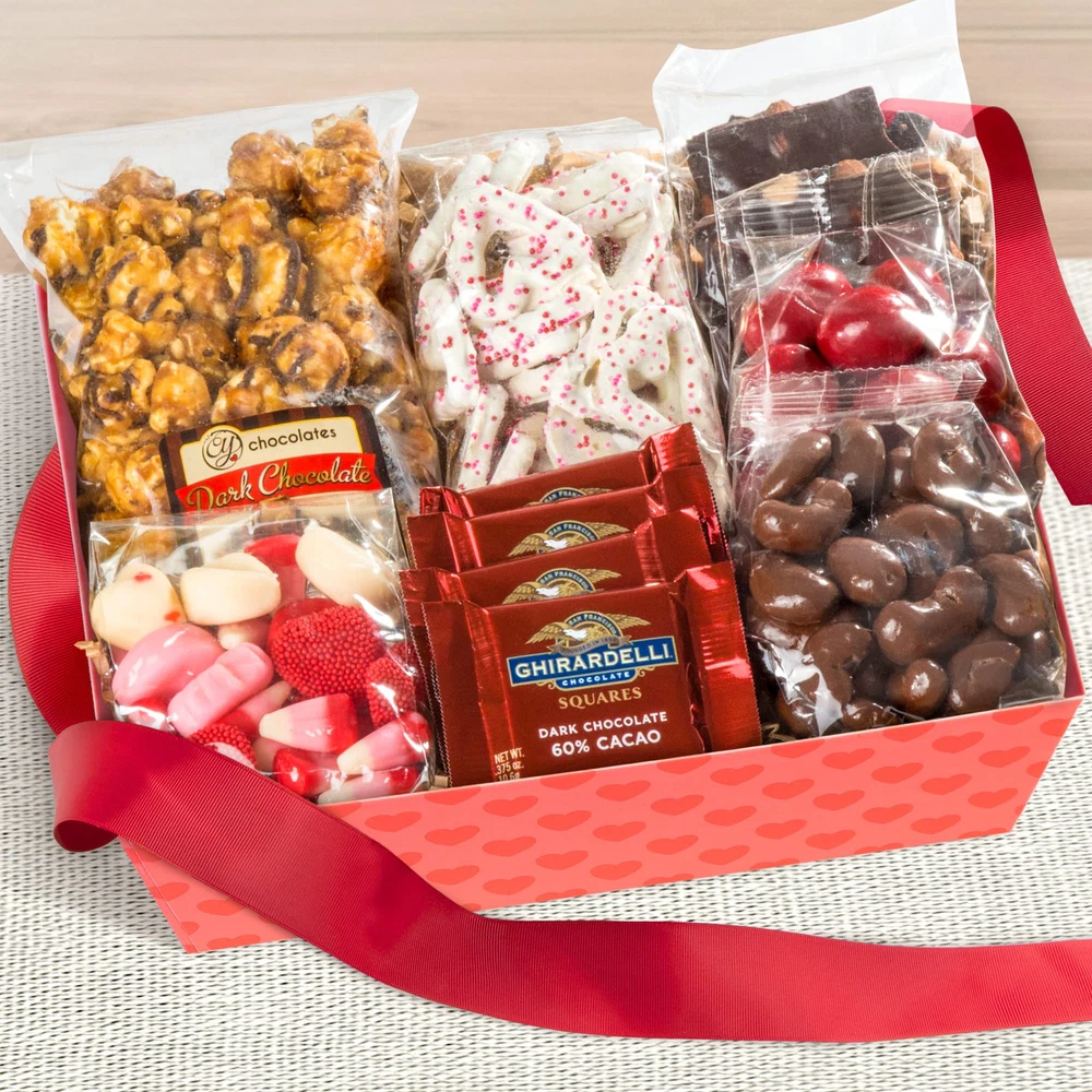 Our favorite Valentine themed chocolate and candies packed in an adorable gift basket perfect to send your love on Valentine’s Day! Hand-made milk chocolate almond bark and gourmet caramel corn. Crunchy frosted heart pretzels, dark chocolate covered almonds and decadent chocolate covered cherries. Tender Valentine’s candy mix and 4 Ghirardelli chocolate squares. Crunchy Raspberry White Chocolate Caramel Corn. Valentine Favorites Candy Mix and White Almond Bark. Ghirardelli Chocolate Squares and Decorated Heart Shape White and Chocolate Confection Covered Pretzels. More Chocolate with Chocolate Covered Dried Bing Cherries and Chocolate Covered Caramelized Sea Salt Cashews. Presented in a reusable keepsake seagrass basket tied with a gift ribbon.