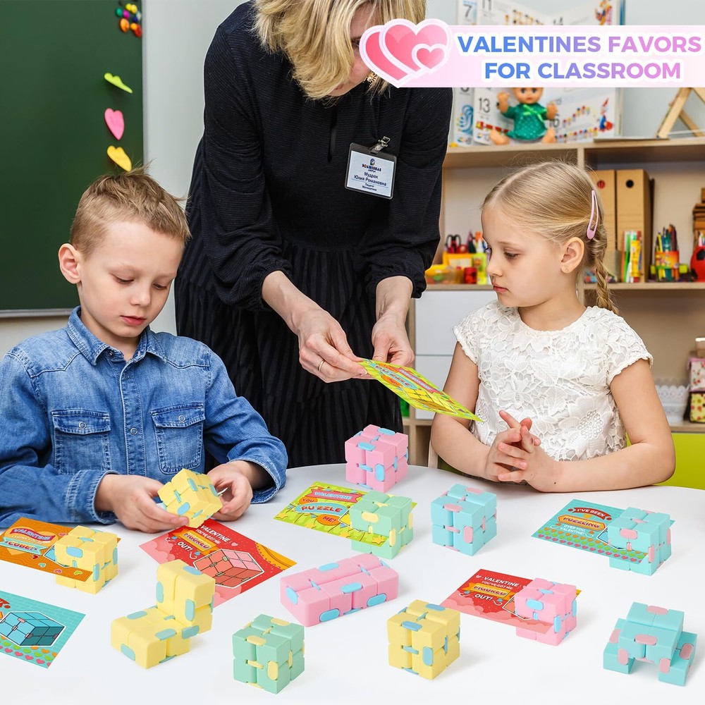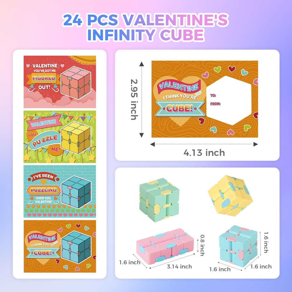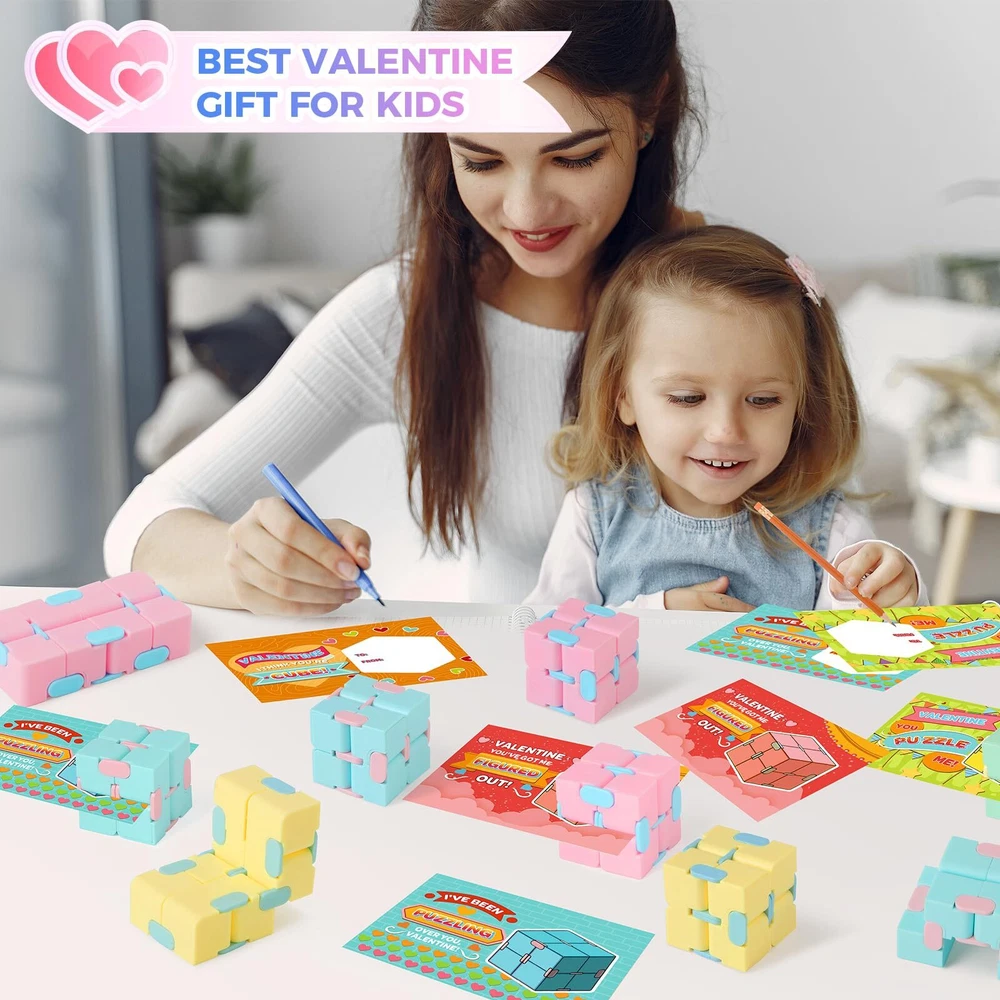 This Valentine's Day gift pack is a total hit! Kids will love the colorful infinity cubes—perfect for keeping little hands busy. The set comes with 24 cubes and matching cards, making it ideal for classroom exchanges or party favors. Bright, fun, and great for sensory play, these fidget toys are a fantastic way to celebrate. Teachers and parents will appreciate the value, and the kids will be thrilled! A must-have for Valentine’s Day fun.