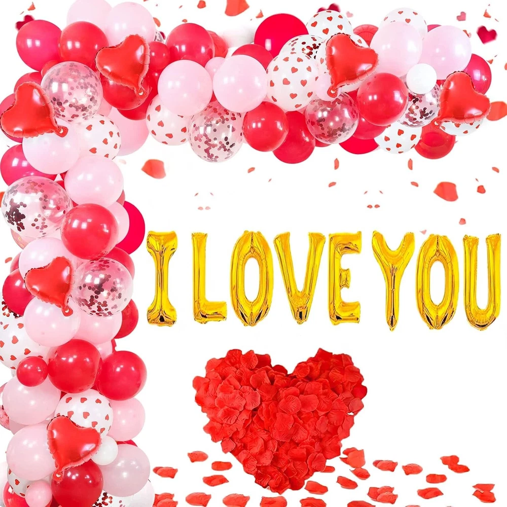 Valuable Valentine's Day Decorations -- Totally 129pcs items, including 60pcs 10 inch red pink latex balloons, 30pcs 5" red pink white latex balloons, 15pcs 12 inch red heart print balloons, 8pcs 12" red cofetti balloons, 10pcs 10" red heart foil balloons, 1 set 16" I LOVE YOU golden foil balloons, 300pcs silk rose petals, 1 roll 16ft balloon arch strip, 1 roll glue. Wonderful Valentines Decorations -- With our these nice bright color party decorations accessories, you can freely make various types of balloon arch garland to create wonderful romantic atmosphere and leave a deep impression on your lover. Great Valentine's Day Party Supplies -- Our sweet valentines balloon arch garland will be the perfect choice for you to decorate your home, bed room, hall, shopping mall, cafe, passageway, indoor or outdoor for Valentine's Day or Mother's Day, romantic party, proposal, galentines day decorations and more. No doubt is each one a great decoration. Easy to Assemble -- Making your own backdrop has never been easier! The balloon garland is surprisingly simple to build, no craft experience needed. Highly recommended filled balloons with air by electric air pump, it would save you lots of time to enjoy your sweet moment. Tips for You -- Please do not inflate latex balloons and foil balloons too full, 85% is fine. And at the same time, please inflate slowly to avoid over inflation.
