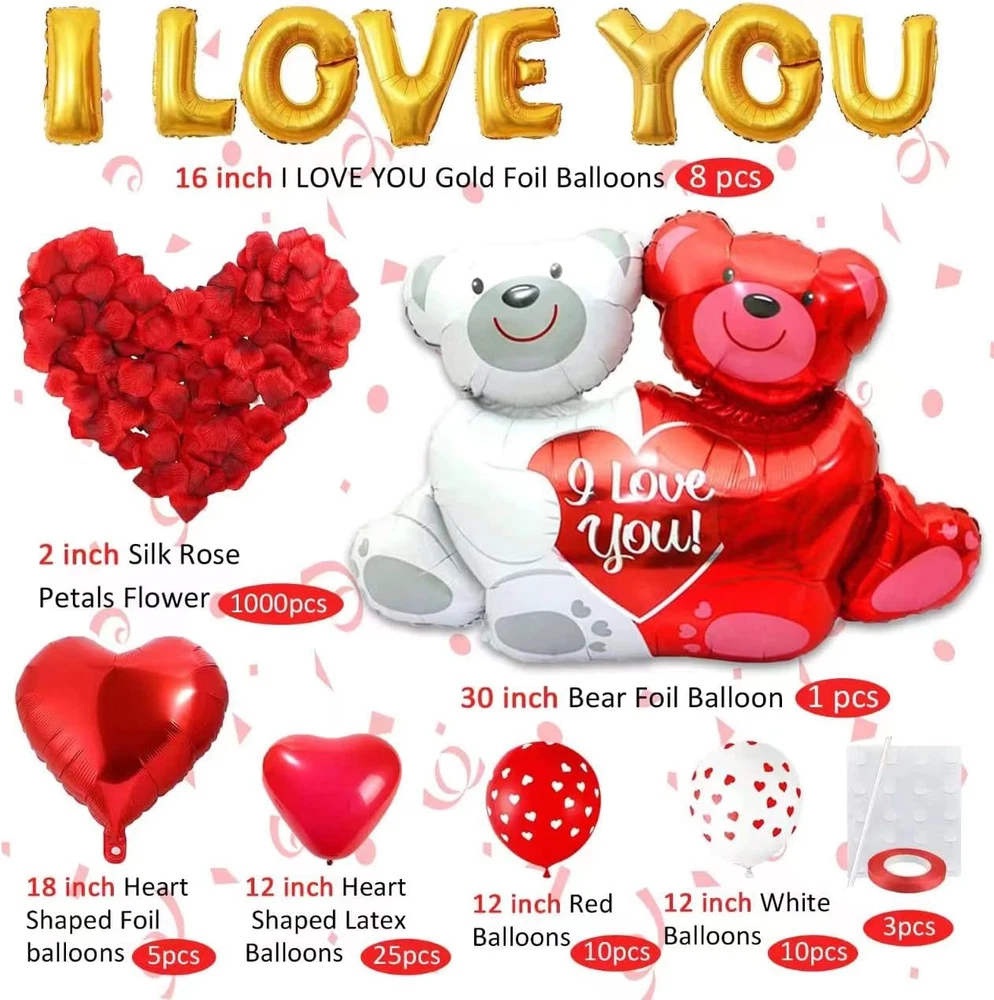 Store New Arrivals Add to Favorite View Feedback Contact Valentines Day Balloons Decor 49 Pcs I Love You Balloons and Teddy Lovebear Red Description Item model number D-63pcs CPSIA Cautionary Statement Choking Hazard - Balloon, No Warning Applicable Item dimensions L x W x H 9.84 x 7.87 x 0.98 inches Color Red Product Dimensions 9.84 x 7.87 x 0.98 inches Material Rubber Country of Origin China Item Weight 8.8 ounces Theme Valentine's Day Manufacturer recommended age 18 months and up Occasion Valentine's Day Special Feature Valentine balloons Cartoon Character Valentines day Balloons Included Components Glue 🎈Valentine's Day decoration set - 8 x 16 inch foil balloon (I love you), 1 x 30 inch love bear balloon, 5 x 18 inch heart shaped foil balloons, 25 x 12 inch love balloons, 20 x 12 inch heart shaped latex balloons, 1000 rose petals, One piece of glue, 1 balloon ribbon, 1 inflatable straw. 🎈1000 pieces of silk rose petals - How could a Valentine's Day decoration be without rose petals? The highest quality polyester silk rose material. Non-toxic and does not fade due to sun or liquid. It looks extremely realistic. This makes it a great addition to your Valentine's Day party, anniversary, wedding, marriage proposal, confession, romantic night. 🎈High-quality Valentine's Day decoration - Our Valentine's Day balloons are made of high-quality latex material and the gas does not leak easily. The Valentine's Day balloons look cute once inflated. All balloons can be inflated with helium. The red silk ribbon is used to tie the balloons You can attach the balloon to the desired place, or fill it with helium, tie it to a red silk ribbon to make it float from the ceiling. It will be a romantic night. 🎈Reusable - These balloons are easy to blow up with a pump. The heart-shaped balloons can float when filled with helium with sufficient concentration. The foil balloons are non-toxic, reusable and more durable with good ductility. Foil balloons are self-sealing and can last longer, usually 1-2 weeks. 🎈Perfect for all romantic occasions - Ideal decoration for many occasions Perfect party accessories and decorations for a romantic and festive atmosphere for weddings, birthdays, christenings, Valentine's Day, anniversary celebrations, engagements, bridal showers, engagement parties, etc. In any special festival, simple romance is given to your favourite people. Product Description Are you still looking for romantic decorations for special evenings? Would you like to celebrate an anniversary with love-themed decorations? Are you looking forward to planning a romantic surprise for your other half for an anniversary, birthday, Valentine's Day, date? It is the most romantic decoration in town and has everything to make your evening unforgettable. Colour red that symbolises love, rose petals to fill your room with fragrance, teddy balloons to light up the night, heart shaped stand up to define the letter love, I love you balloons say the love you want to share with them and filled ceiling with hanging balloons with tied ribbons to make the ambience romantic. It will be a proper remake of your normal bedroom or hotel room into a room of love. Well, it is one of the recommended surprise decorations when it comes to expressing your love. Sometimes words are not really enough to describe your love for your better half, and as we say, actions speak louder than words, so take action and create happy memories. 63 pieces Valentine's Day decoration set 8 x 16 inch foil balloon (I love you), 1 x 30 inch love bear balloon, 5 x 18 inch heart shaped foil balloons, 25 x 12 inch love balloons, 20 x 12 inch heart shaped latex balloons, 1000 x rose petals, 1 inflatable straw, 1 balloon ribbon, One piece of glue. Still planning your Valentine's Day party? Brighten up the event with this beautiful Valentine's Day decoration set with bear balloon and heart balloon! A set of perfect love decorations for a romantic surprise for your loved one. Perfect party supplies and decorations to spread the love in your room or any party space with classic Valentine's Day decorations for the home, trees, outdoor space or office. Surprise her! Give her a wonderful surprise and leave her speechless. For her birthday or just to tell her how much you love her, decorate her day with these fantastic balloons! Rose petals are an indispensable part of Valentine's Day decorations are made of high quality polyester, These pretty rose petals will not fade or wilt, can be used again and again. In any special holiday, your favourite person will get a simple romance. On the floor, in the bathtub, on the bed covered with our romantic rose petals, there are lots of balloons decorating the whole room. The red heart balloons float on the ceiling. When your love sees the "I LOVE YOU" balloon, she is sure to be deeply touched and it is also a great surprise. Polyester silk material of the highest quality. Non-toxic, will not fade due to sunlight or liquids. They look lifelike. Make them a wonderful decoration for your Valentine's Day party, anniversary, wedding, marriage proposal, declaration of love, romantic night. ABOUT US We offer the best prices around on high quality products. Our E-store includes media such as books, movies, music and games while offering electronics, toys, sporting apparel, clothing, tools, general home, garden items and more. SHIPPING Free Shipping We are always working hard to ensure your package arrives as soon as possible. Please understand that some factors like weather, high postal traffic, and the performance of shipping companies are outside of our control. We offer free shipping to the lower 48 states and ship within 2 business days of payment, usually sooner. We do not accept P.O. Boxes. Please provide a physical address. For shipping outside of the continental USA, we only use eBay's Global Shipping Program.The item is shipped to KY and then sent to the rest of the world. International customers are responsible fo