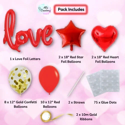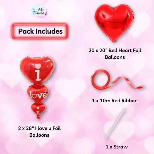 Valentine's Day Balloons: A Perfect Expression of Love Make this Valentine's Day unforgettable with our charming selection of Valentine's Day Balloons! Designed to capture the spirit of love and romance, these balloons come in a variety of shapes, sizes, and vibrant colors. From heart-shaped helium balloons to cheerful foil designs adorned with sweet messages like "I Love You," there's something for every celebration. Whether you're planning a romantic dinner, surprising your special someone, or setting the scene for a heartfelt proposal, our Valentine's Day Balloons add a whimsical and festive touch. Made from high-quality materials, they're long-lasting and perfect for creating a dreamy atmosphere. Pair them with flowers, chocolates, or gifts to craft a complete Valentine's Day surprise that says it all without saying a word. Share the love and make their heart soar with our enchanting balloon collection! Please see photos for what's included in each pack.