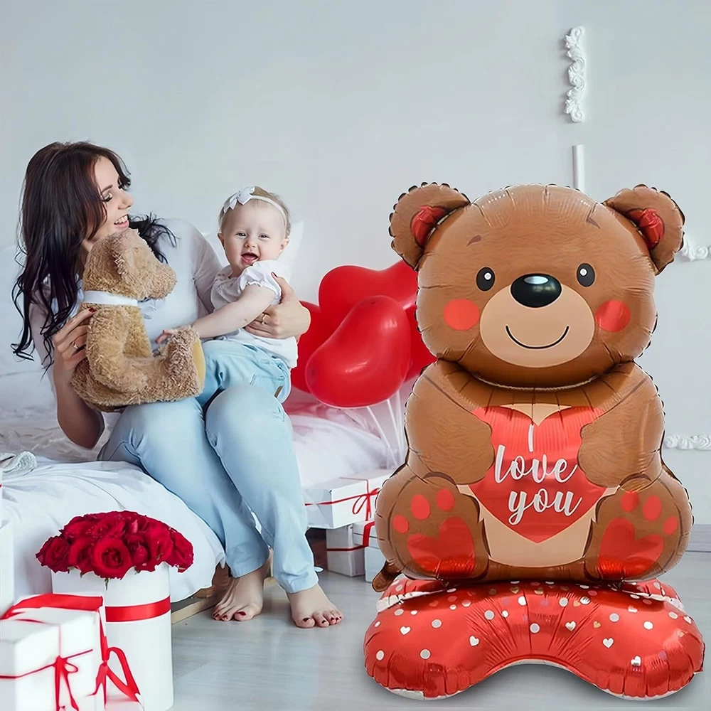 "Valentines Day Bear Balloon, 58in x 31in Standing Balloon for Party Decoration About this item: Adorable Bear Design: The standing balloon features a cute brown bear with a red heart on its belly, along with the "Love You" lettering, creating a romantic and playful atmosphere perfect for Valentine's Day parties, dates, or weddings. Easy Setup: The unique standing design eliminates the need for traditional balloon stands. Simply inflate to complete the shape, making it quick and easy to set up and saving time and effort for any event. Safe and Sturdy: Made from high-quality foil material, these balloons are durable and stable, maintaining their beautiful appearance for an extended period. Ideal for both indoor and outdoor settings. Double Heart Shaped Base: The two heart-shaped bases provide added stability while enhancing the romantic vibe, making this balloon arrangement the perfect decoration for weddings and Valentine's Day celebrations. Great for Any Setting: With a size of 58 inches x 31 inches x 31 inches, this standing balloon is ideal for a variety of events. It works beautifully as a standalone decoration or complements other Valentine's or wedding decor effortlessly.