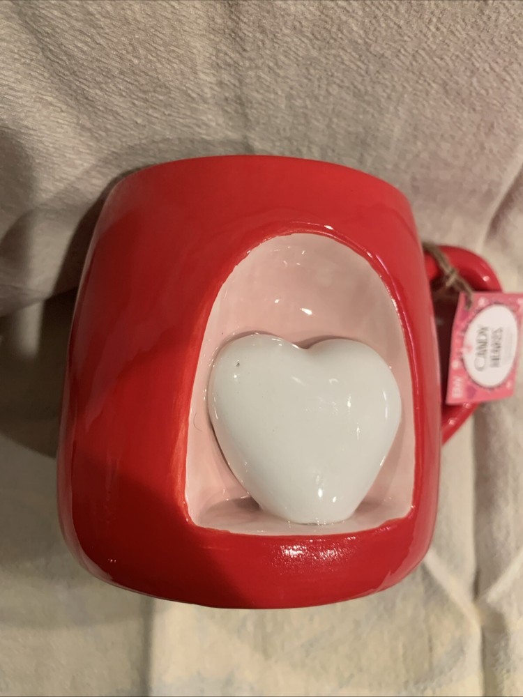 This beautiful mug is perfect for any occasion, whether you're drinking hot or cold beverages. Its unique heart shape and red color make it a great addition to your collection. The design is hand-painted and features the Candy Hearts franchise. Made of high-quality ceramic and porcelain, this mug is both microwave and dishwasher safe. It has a handle and can hold up to 20oz of your favorite drink. Its size is medium, with a height of 4 inches and a width of 3.5 inches. This original, art deco style mug is sure to impress your guests.