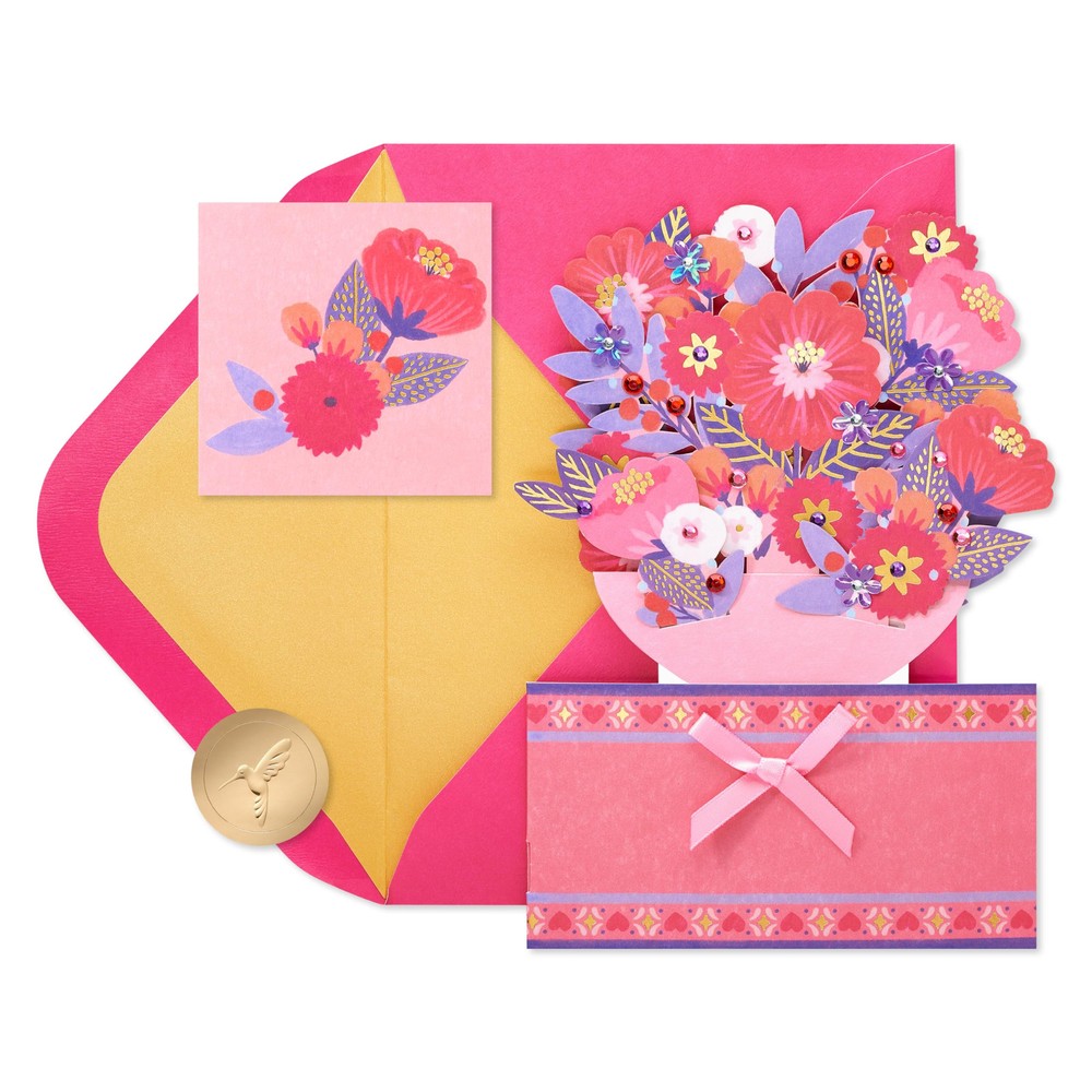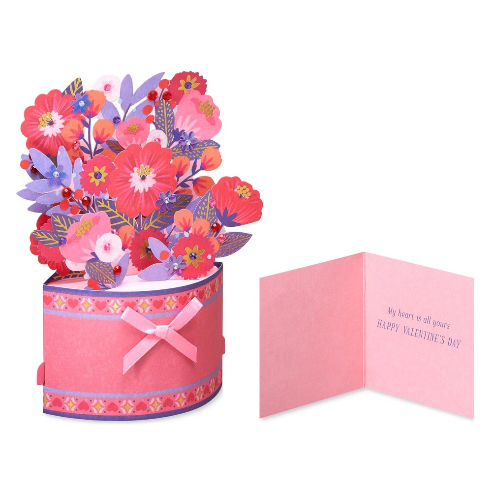 A displayable pop-up bouquet complemented by a sweet mini card highlights this spectacular valentine! Beautiful pinks, reds, and purples are brought together throughout the pop-up floral display and card design. This premium Valentine’s Day keepsake features embellishments including laser-cutting, layered paper attachments, gems, sequins, a pink bow, and gold foil accents. The card message is suitable for anyone who has won your heart and partners nicely with the pop-up display. Extra postage is required (but worth it) when you send that special someone this amazing Valentine’s Day card and pop-up bouquet from ! Front Message: Blank Inside Message: My heart is all yours Happy Valentine’s Day This Premium Valentine's Day keepsake card by features a pop-up bouquet accessorized by embellishments such as layered paper attachments, gems, sequins, a pink bow, and gold foil accents This card measures 5.625 in. x 7.5 in. Coordinating pink envelope and unique gold seal included. Extra postage may be required. offers premium stationery, greetings cards, gift wrap, gift bags and entertaining products for everyday occasions and all holiday seasons--all with unique designs and quality embellishments.