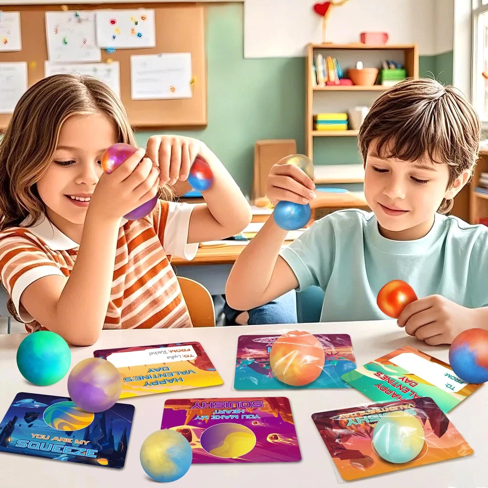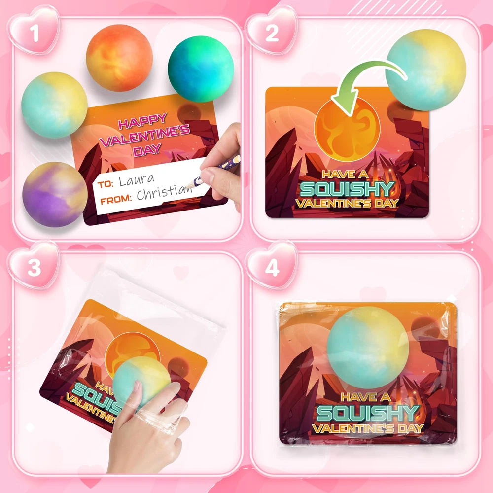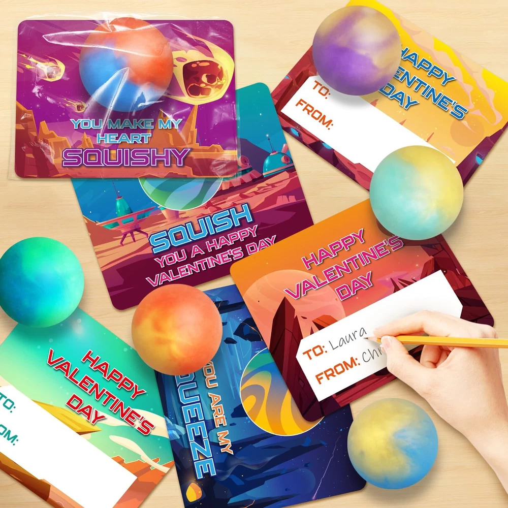 What's Valentines Set include: Valentines day card set includes 24pcs slime ball with various colors and 24pcs space themed valentines day card in 6 different designs, enough for the whole class and perfectly match Valentine. The size of slime balls are suitable for kids to play, even little hands. This Valentines gifts set that kids can share and spread love through exchange in school, and they will surprise when they got it. Well-Designed Valentine's Cards: There are 6 unique designs of Valentines cards in space themed that will attract the kids. The cards have both sides. On the front, there are some interesting greetings and on the back, kids can write their names on it. It will improve children's social skills. It will be a wonderful Valentine's gifts exchange of kids in school. Ideal Valentine's Gifts For Kids: There are two colors inside the ball and like a planet, which will attract more attention for kids and they will enjoy the entertaining time. This slime ball has great elasticity and quickly recover. Kids can pull & stretch & twist & squeeze & press.It will enhance child’s imagination and creativity. It will perfect for kids classroom school exchange, Valentine's class events,Valentine's day gift exchange, Valentine's school classroom prize and so on. Super Quality: Our slime ball kits are made of high quality materials and non-toxic, perfect for 3 years old and up to play it. No matter how much you squeeze it, it will always keep your hands clean. It’s a great choice to release pressure. It can improve our relationships with family and friends. Ideal Valentine’s day gift for boys and girls. Enjoy a happy Valentine's Day! Enjoy A Happy Valentine's Day: Valentine's Day is an opportunity to show and share your love, if you want to improve your child's social and expressive skills, our Valentine's day card will suitable for your Valentine's party favors. It will be a Valentine's Day that full of meaning and romance. If you have any questions, please feel free to contact us. We will reply to you within 24 hours and help you to solve problem immediately.