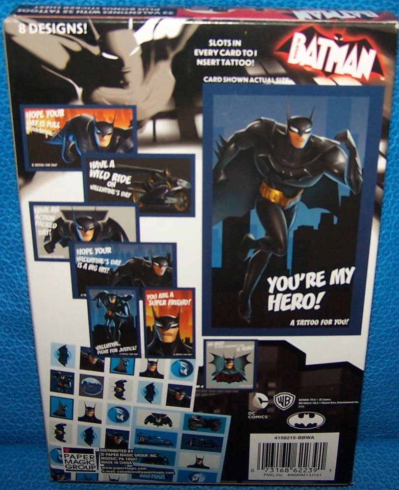 We ship the same day that payment is received We will combine shipping on international orders (Based on weight) to save on cost Please email for a Combined Shipping Quote. We will adjust the invoice before final payment is made. New in Box / Never Opened Valentines Box of 32 Beware The Batman with 35 Tattoos plus bonus sticker sheet includes 48 heart shaped seals 8 Different Designs Shipped in a protective box Shipped From a Smoke and pet free home Please e-mail for worldwide destinations. We ship via first class international mail for our worldwide shipments. In most countries it normally takes about 15-18 days for arrival with customs delays. We cannot be responsible for customs delays. When your item has been shipped, we will email the customs form number. Please e-mail me with any questions. Be sure to check back new items added daily. Fast Shipping Thanks for looking!!