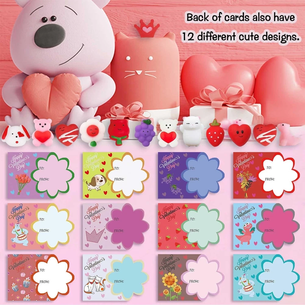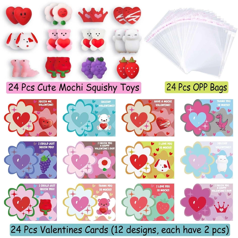 Valentines Day Cards Gifts for Kids, 24 PCS Mochi Squishy Party Favors Set with Valentine's Day Greeting Cards for Kids Valentine Classroom Prizes Party Favors, Valentine Exchange Gifts Set Product Details Style: Valentines Day Party Favors Brand: ricluck MPN: HEM1001 UPC: 744430177641 EAN: 0744430177641 Material: Rubber Brand: ricluck Unit Count: 1.0 Count Theme: Animal Item dimensions L x W x H: 6.5 x 5.2 x 0.8 inches Occasion: Valentine's Day Item Weight: 8.2 Ounces Manufacturer: ricluck UPC: 744430177641 Age Range (Description): Kid Product Dimensions: 6.5 x 5.2 x 0.8 inches Item Weight: 8.2 ounces Item model number: HEM1001 Manufacturer recommended age: 36 months - 12 years Super Value Valentine Day Gift for Kids: The 24pcs valentines squishy toys with greeting cards are perfect for kids, boys, girls, toddlers, valentines toys, valentines gifts, valentines party favors, school event prizes, class exchanging gifts. Easy to Use: Come with 24pcs transparent bag, put the mochi toy and the card in it then you can get a perfect valentines day gift, you can sign or write blessings on the greeting card, give a creative & super cute valentines gift for kids, classmates, friends or families. Endless Fun to Play: Our Valentine's Day Squishy Toys are great for kids girls boys. Squishies can be stretched, twisted or squeezed, which can bring more fun to people. Also can effective to release your stress, anxiety, increase blood circulation of hands. Reliable & Reusable Material: Valentine's Day cards for toddlers are made of quality card-stock, sturdy & hard; the mochi stress relief toys are made of safe and soft rubber with super good touching feeling, which is flexible & durable, suitable for kids to use. Wide Application: These exquisite valentines day cards gifts are suitable for boys and girls in classroom communication, preschool or elementary school parties, Valentine's Day activities, Valentines exchange gift, etc. Our Valentines Day Party Favors with 24 pieces of lovely squishy valentines toys with greeting cards. It can create a romantic Valentine's Day atmosphere to make your party full of surprises and laughs. Perfect Valentine gifts for your kids, friends,family. Specifications: Styles: Valentine's Day Color: As picture shows Materials: Premium washable silicone Package includes: 24 PCS Valentines Day mochi toys 24 PCS Valentines Day Greeting Cards 24 PCS Transparent Bag