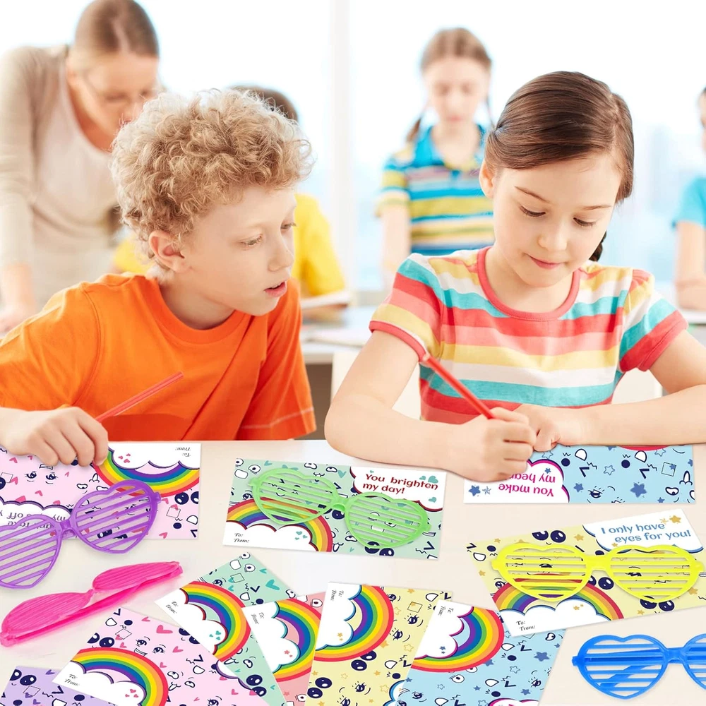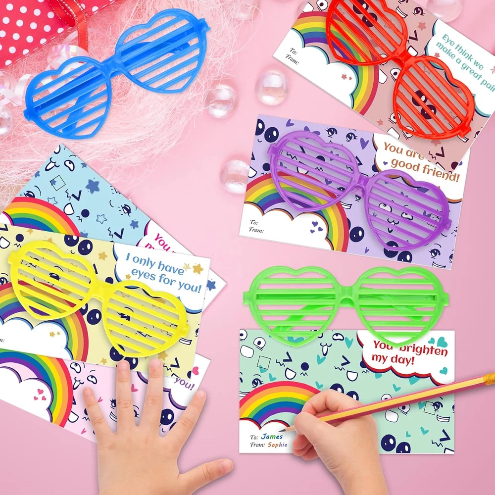 Value Valentine's Day Card Set For Kids - The package contains 36 glasses in 6 colors, and 36 cards with 6 different designs. It is sufficient quantity can meet the needs of kids in various parties and is suitable for Valentine's Day gifts and classroom activity prizes, they will surprise the kids in Valentine's Day. Cute & Colorful Card Design - 36 Valentine's Day greeting cards with 6 designs in different eye expressions which have cute and colorful patterns. And the front of each card contains special greetings, giving him/her the most sincere blessings, which is an ideal choice for kids gift cards on Valentine's Day. Safe & Reusable Glasses - The shutter shade glasses will not block the child's sight, they are made of the highest quality plastic, which can be safely used by kids, and the weight is very light, so there is no need to worry about burdening the children. The novel colorful glasses will amaze all children at the Valentine's Day party and bring more fun to boys and girls. Kids Valentine's Day Party Favor - The kids can write the name of the person they want to give on the card, and give these Valentine's Day cards to classmates, friends or family to express love for them. Let the children spend an unforgettable Valentine's Day together by exchanging Valentine's Day cards in class. Guaranteed Purchase - If for any reason you are not completely satisfied with your purchase, please click the "Seller Contact" button to send us an email, once we receive your message, we will solve it until you are satisfied. Product Description