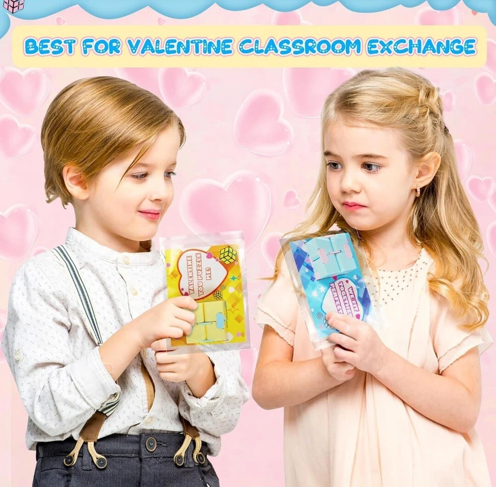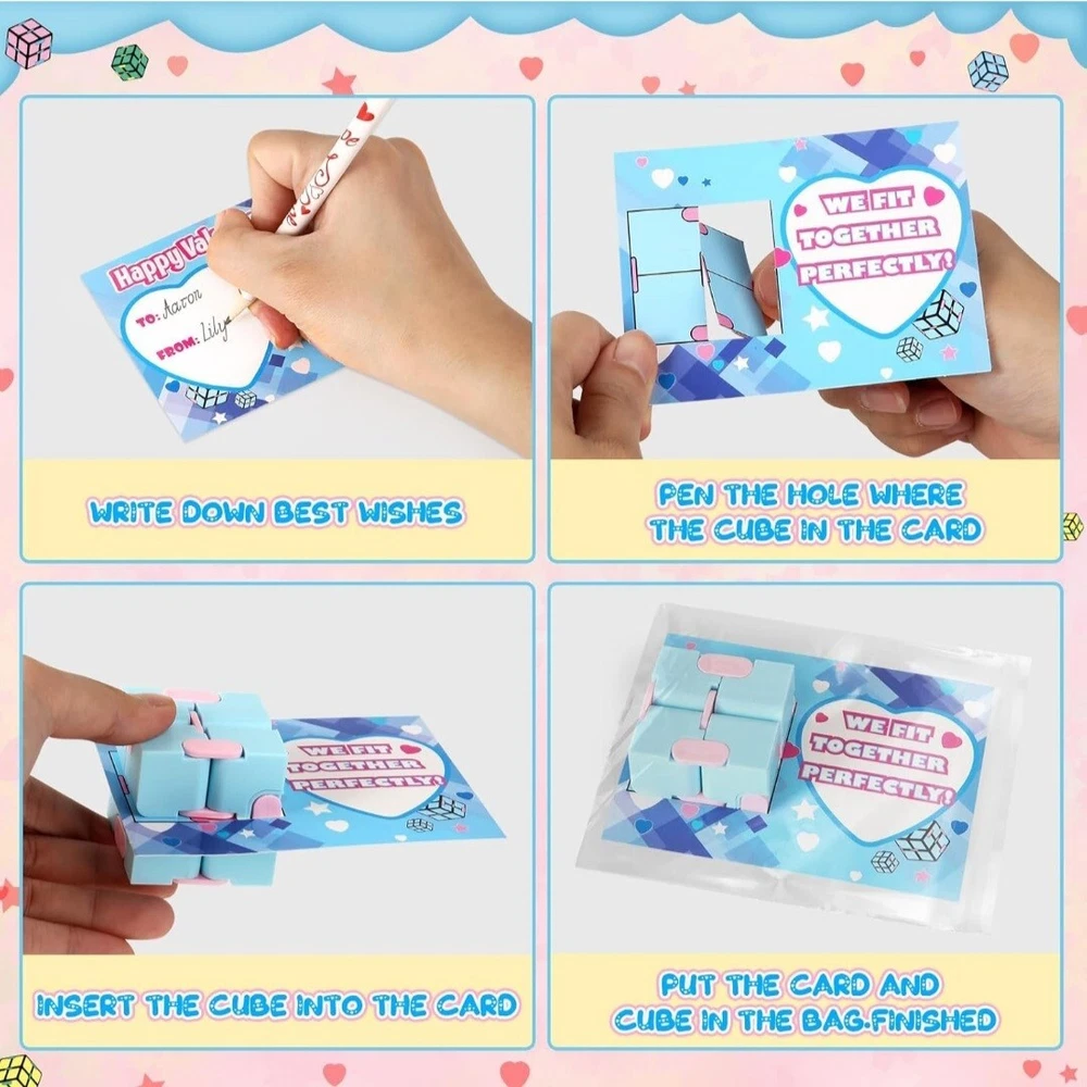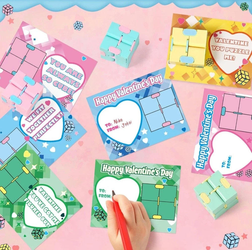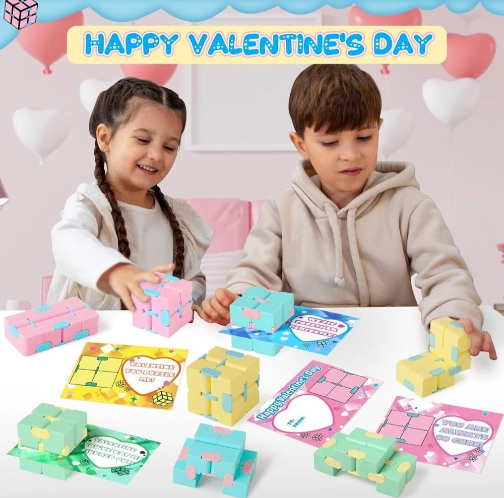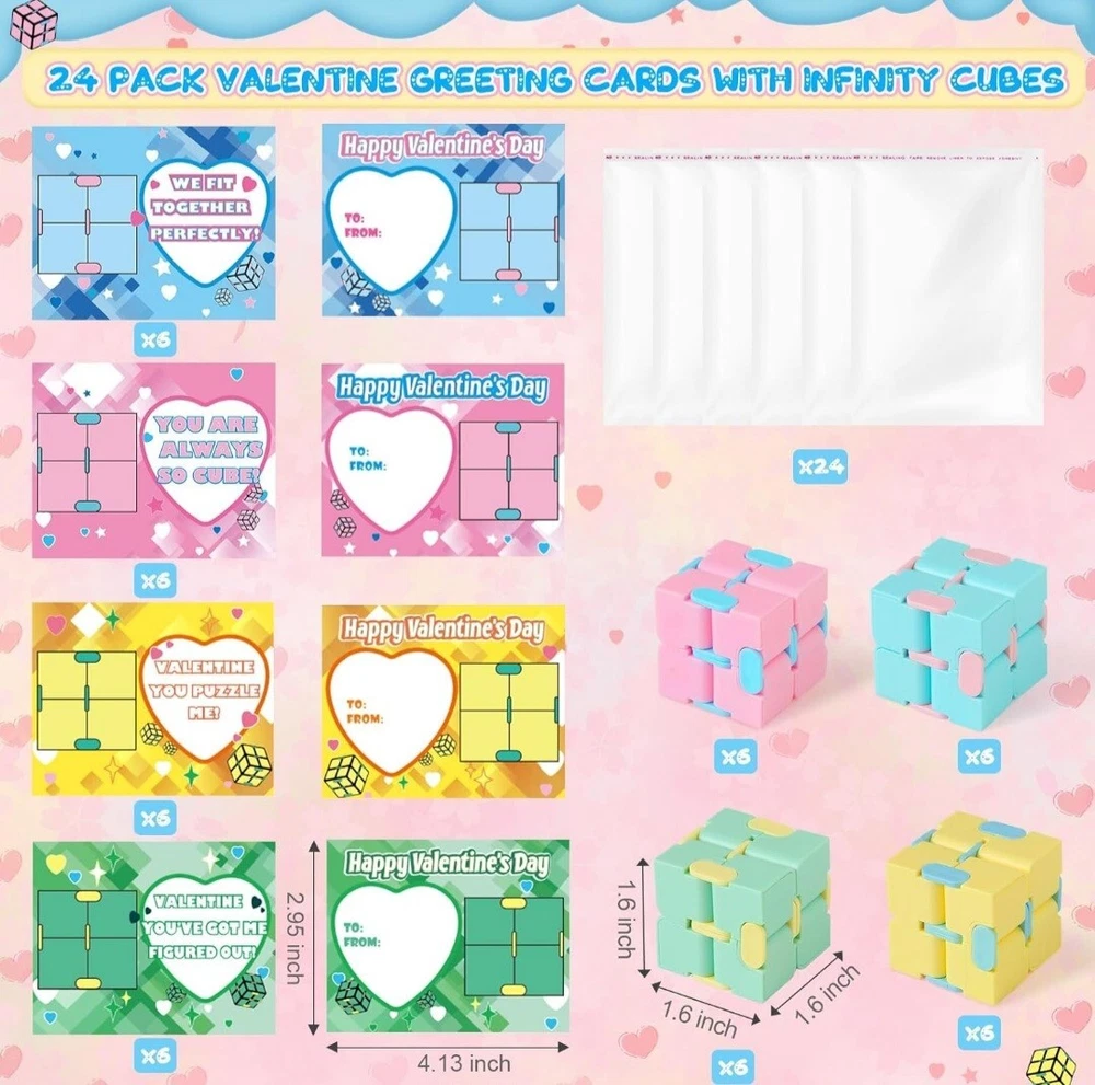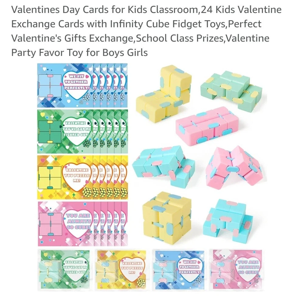 Valentines Day Cards for Kids Classroom,24 Kids Valentine Exchange Cards with Infinity Cube Fidget Toys,Perfect Valentine's Gifts Exchange,School Class Prizes,Valentine Party Favor Toy for Boys Girls ColorMulticolor MaterialAcrylonitrile Butadiene Styrene, Acrylonitrile Butadiene Styrene (ABS) BrandOCHIDO Unit Count24.0 Count ThemeValentine's Day Item dimensions L x W x H7 x 0.5 x 10 inches SUPER VALUE VALENTINES DAY CARDS FOR KIDS: This valentines day super values set included 24 valentines day cards(Each card has a different, cute, humorous message),and 24of Infinity Cubes (4 different colors) ,24 bags easy about kids to carry and exchange valentine's day gifts. Enough quantity can meet the needs of kids in various parties and is suitable for kids valentines day gifts. CUTE VALENTINES'S CARDS FOR KIDS :Our Valentine's greeting cards with infinity cubes kits is perfect for valentine's day gifts for kids classroom. Kids Valentine's Day cards are in bright and eye-catching designs, just need to sign on " To " and " From " , put the gift card into the bag of infinity cubes kit, and hand them out to their friends of valentine's day , It will surprise everyone that receives the gift . This will make the most popular valentine's day gift exchange of kids . EXCHANGE GIFT AND SHARE LOVE:Valentine's greeting cards with infinity cubes kits are perfect for kids classroom exchanges, school Valentines parties, Valentine's event, classroom exchange gifts. It's the NO.1 choice for Valentine's gift for kids,school valentine's game prize or any Valentine's events. SAFE FOR CHILDREN: Our fidget toys is made of of ABS plastic material, non-toxic, non-BPA,and abides by US toys standards. Designed with a smooth surface and rounded corners to keep kids safe,big hit for Valentine's Day party at school.The infinity cube is 1.6 x 1.6 x 1.6 inch in size, perfect for kid's hands. kid can put them in pocket so can have fun anywhere and anytime. It can enhance the relationship between friends,giving an unforgettable valentine.