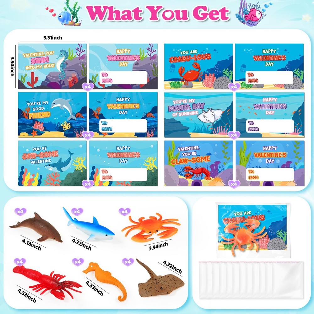 【Super Value Pack】Surprise your child with this delightful Valentine's Day gift set that includes 24 expandable ocean animals and 24 matching Valentine's Day cards. It's a fun and heartfelt way to celebrate love and friendship. 【Interactive Valentines Party Supplies】Discover 6 unique ocean animal designs, each coming with 4pcs, totally 24 animals. These ocean animals will bring the ocean magic to your child's Valentine's Day celebration. Watch as these ocean animals grow to full size when placed in water. The expansion process is fascinating and adds an extra layer of fun to the gift. Kids will love watching their tiny sea creatures transform into larger versions. 【Beautiful-Designed Valentine's Cards】Our set includes 24 colorful Valentine's cards, printed on sturdy paper to ensure durability. Customize each card with your personal message, making them perfect for classroom exchanges or as heartfelt gifts for your child's classmates. 【Kids Valentines Day Party Favors】These Valentine's greeting cards with sea animal toys are perfect for classroom exchanges, preschool or elementary school Valentine's parties, Valentine's events, or any Valentine's game prizes, love notes, party favors and more! They are the ideal Valentine's Day gift for boys and girls. Valentine's Day Gift Cards will provide endless fun and entertainment for your kids! 【Enjoy Fun & Share Love】Give your little one a special Valentine gift instead of candy treats! Kids can write by themselves and give the cards and gift for their classmates, friends or family to express love for them. we believe that will bring you an unforgetable Valentine's experience. If you have any problem, please contact us within 24 hours, our customer service team will try our best to solve the problem for you.