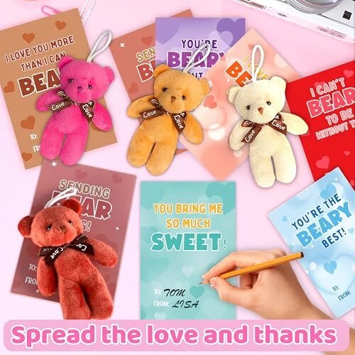 These little bears are absolutely adorable! My daughter was thrilled to hand them out at her class party. The cards were perfect for personal messages, and the plush toys made each one feel special. Everything arrived quickly and was exactly as described - such great value for the price!