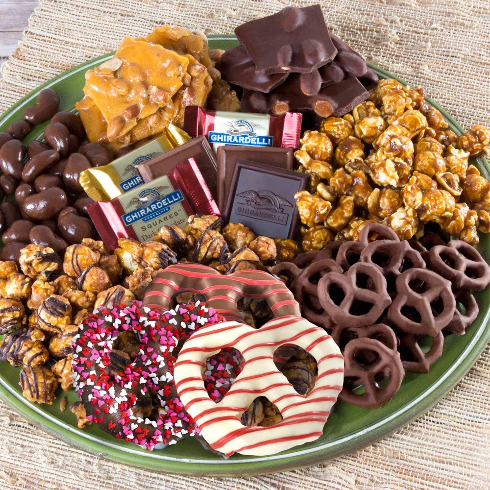 A red happy Valentine's Day ribbon encircles this large gift full of Valentine's gourmet goodness! Two large bags of hand-popped gourmet gooey caramel corn made with rich, creamy real butter pairs with two bags of sweet chocolatey pretzels and white chocolate, Caramel drizzled pretzels, crunchy peanut brittle, chocolate-covered sea salt Cashews, real chocolate Almond bark, and a half-dozen of ghirardelli's fine individually wrapped chocolate squares. A gift that will delight any Valentine, there are tasty handfuls of yummy deliciousness, attractively packed into a reusable seagrass gift basket and tied with a happy Valentine's Day gift ribbon for perfect presentation. Best selling deliciousness: thousands of gift-givers can't be wrong! One taste of our Caramel corn, including both straight caramel and real-chocolate drizzled, and you will be won over. Handmade chocolates. The melters are full of real chocolates, pouring out pans of chocolate barks, pressing whole almonds into the warm, thick Slabs. Nothing but the best will do for our customers! A gift decadent enough celebrate Valentine's Day with the one you love! Handfuls of chocolate Sea Salt Cashews, chocolate pretzels, caramel pretzels, peanut brittle, and chocolate Almond bark. Ghirardelli Chocolate squares: a half-dozen assorted dark and caramel real chocolate squares from the famous San Francisco chocolatier. Renowned chocolates everyone recognizes! Sending as a gift? See alternate image for Instruction on how to include A GIFT MESSAGE. Be sure to sign your name, so your recipient KNOWS who to thank!