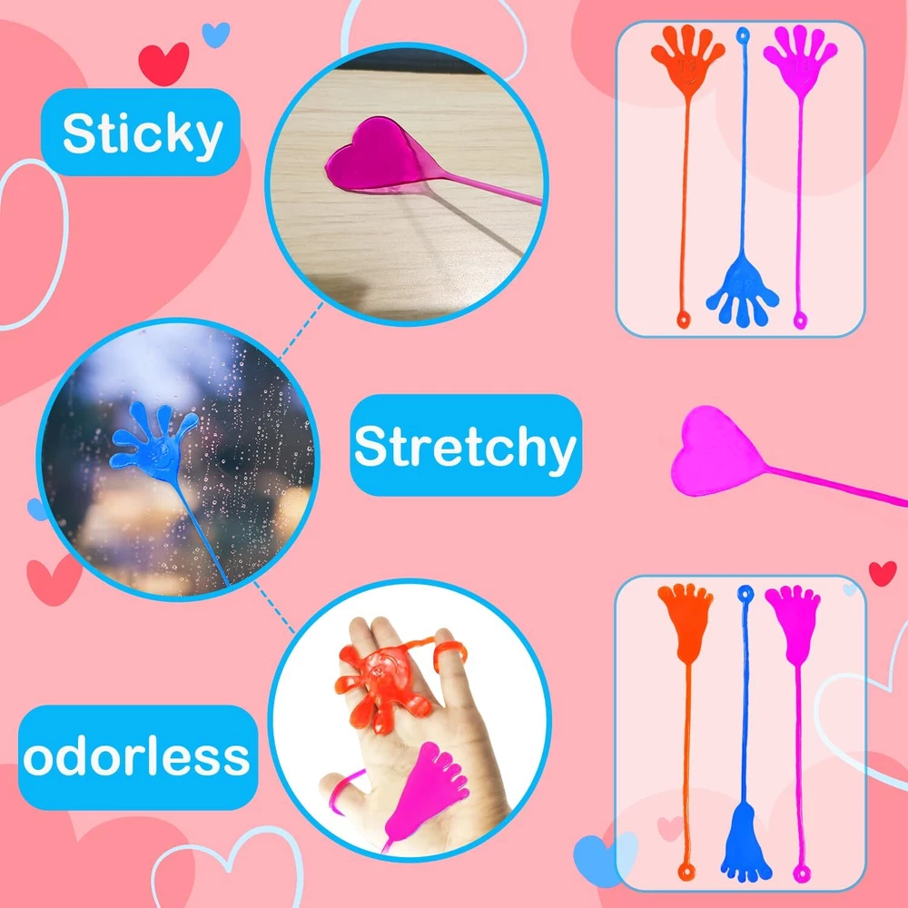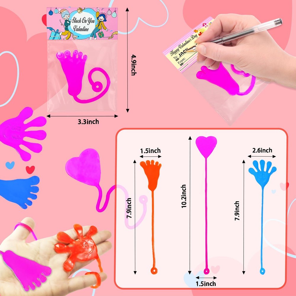 28 Valentines Toys with Cards - This set includes sticky hands, sticky feet, sticky hearts with Valentines cards that allow your kids to write names on them. Valentines Gifts for Kids Classroom - Great Valentines school class gifts for your kids to give out to their classmate and friends on Valentine's Day. Valentines Party Favor Supplies - Excellent fun gifts goodie bag stuffer filler prizes non candy treats for kids party at school. Stretchy & Slimy Toys - These toys are made of vinyl, which is sticky, slimy, stretchy, and gooey. Kids' Favorite Stuff - Kids will love tossing and flinging them on the ceiling, walls, windows, and tables. It will keep them entertained for hours. Fun for All Ages - Perfect for preschool, kindergarten, daycare toddler boys girls and older kids who love playful fun.