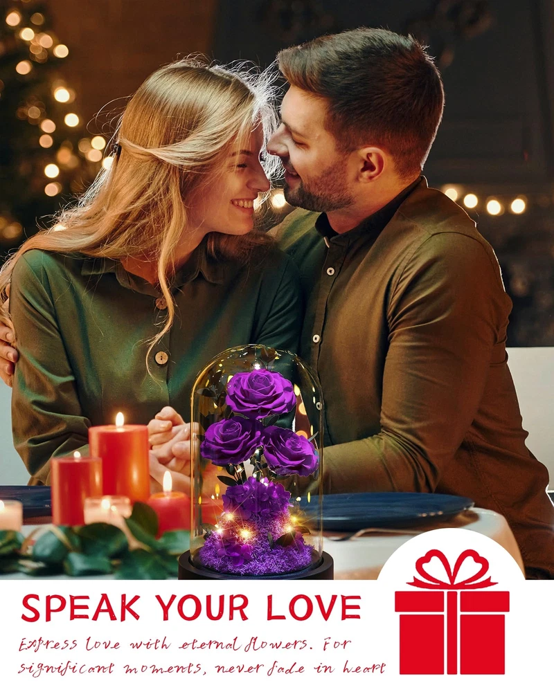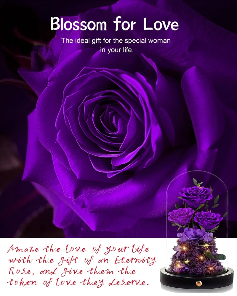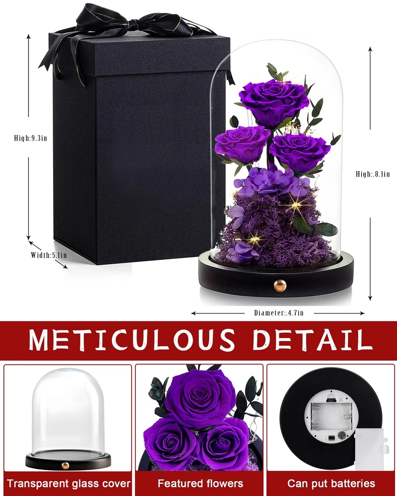 [Unique Gift]The eternal rose symbolizes eternal love and long-lasting friendship.On important occasions such as Mother’s Day, birthdays, anniversaries, Thanksgiving, Christmas and Valentine’s Day, express your precious love for her with our well-preserved real roses. [Handmade Real Rose]3 heads of handmade natural roses Decorated.with leaves, hydrangea and other special accessories.Placed in a durable glass dome on a wooden base, them more romantic and beautiful. [Gifted Packing]Packed in our special exquisite gifted box (dimension 4.7"*4.7"*7.9", weight 2lb). [Rose craft]Preserved flower is made of natural rose with unique preservation process, most keep the same color, shape and feeling of fresh cut flower. The artware gift is made of high quality borosilicate heat-resistant glass, environment friendly. [Easy Maintenance] This artificial immortal flower will maintain a soft and fresh shape and will not wither for 1-3 years in the shade. No watering, no sunlight.