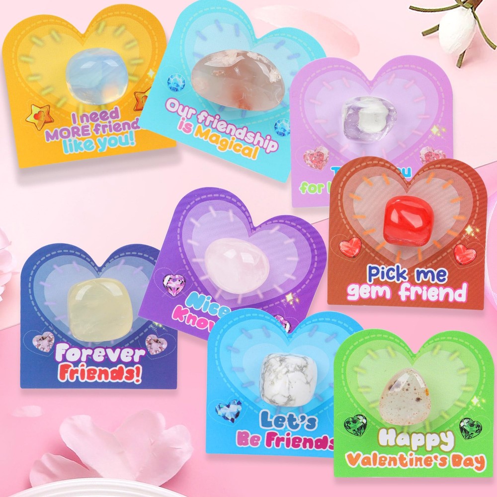 These Valentine's Day exchange gifts are a hit! The natural gemstones are beautiful, and the colorful cards add a sweet touch. Kids love the surprise of different crystals, and the organza bags make them look extra special. Perfect for classroom exchangesâaffordable, fun, and unique. The glue points make assembly easy, and the variety keeps it exciting. A great way to spread love and spark curiosity about nature!