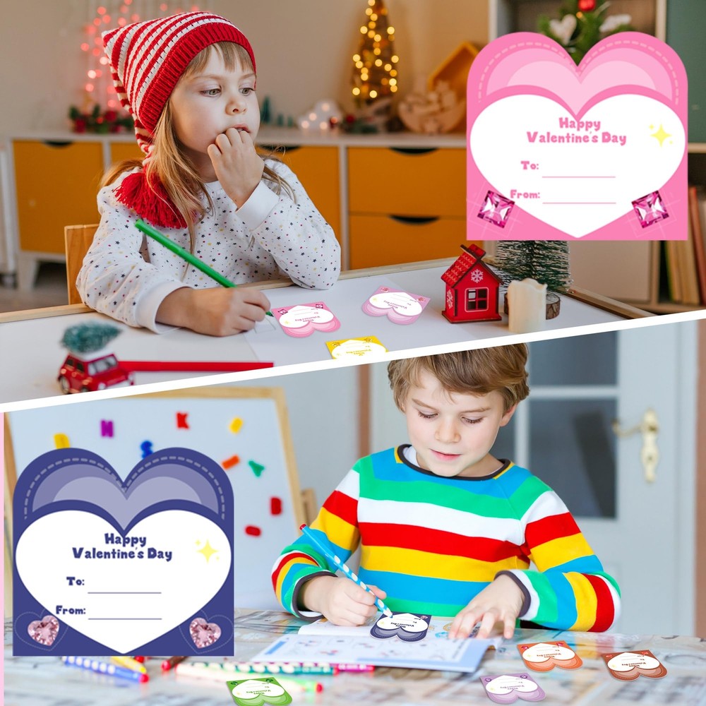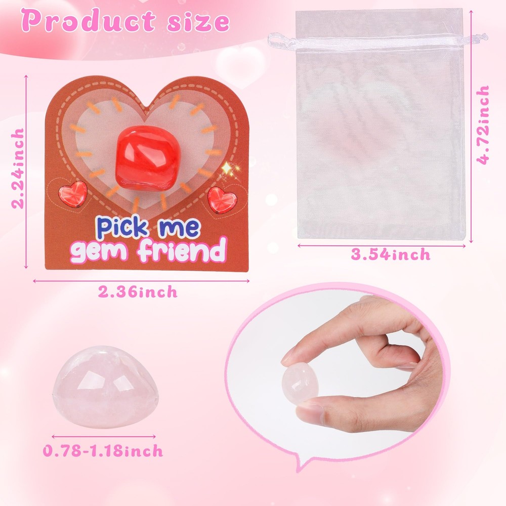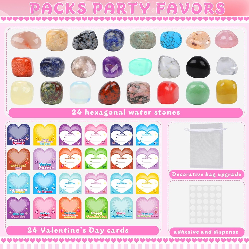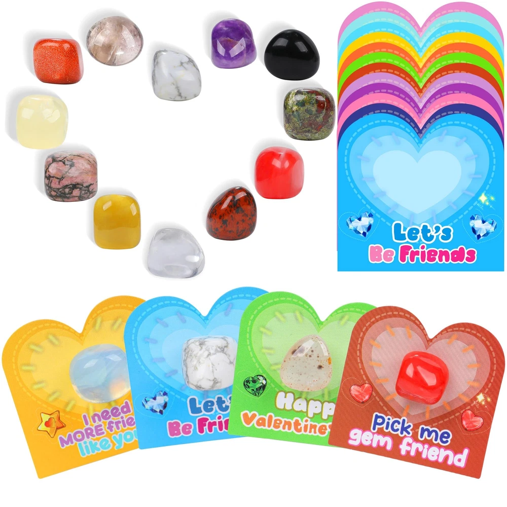 Valentines Day Exchange Gifts for Kids with Natural Gemstone - 24 Pack Valentines Day Cards Natural Gemstone Crystals Rocks Minerals Bulk for Boys Girls Toddlers Class School Party Favor đăPackage IncludesăYou will get 24 pack of Valentine Gemstones for Kids Kit, including 24 pcs healing stones, 24 pcs Valentine day cards in 12 types, 24 pcs white organza gift bags and glue points đăValentines Day Cards for KidsăValentine's Day cards are colorfully printed in 12 designs with heartfelt greetings. You can write down your wishes and sign on our Valentine greeting cards, then send as romantic and interesting gifts to your classmates, friends, and loved ones đăSimple Assembly, Full of Heartă Just combine the heart-shaped gemstones with matching Valentine cards and place them in the clear bags. Your child will have a unique and adorable Valentineâs gift ready to delight friends, classmates, or family. Itâs a fun way to encourage social connections and creativity! đăVersatile for Any Eventă: Our set is perfect for classroom exchanges, preschool or elementary school parties, or any Valentine's event. It brings joy and excitement to both kids and adults alike. This ensures the variety and uniqueness of each gift đăFunny Party Favors for Kids ăThese bulk rocks and gems collection kit is perfect for birthday gifts, party favors for kids, Valentine's exchange cards, valentines cards for kids, easter basket stuffers bulk, classroom prizes, scientific-educational gifts, school class preschool rewards, and Christmas goodie bags. Awesome alternative to candy/treats! It's a great gift for kids, girls, boys, toddlers, and teens.