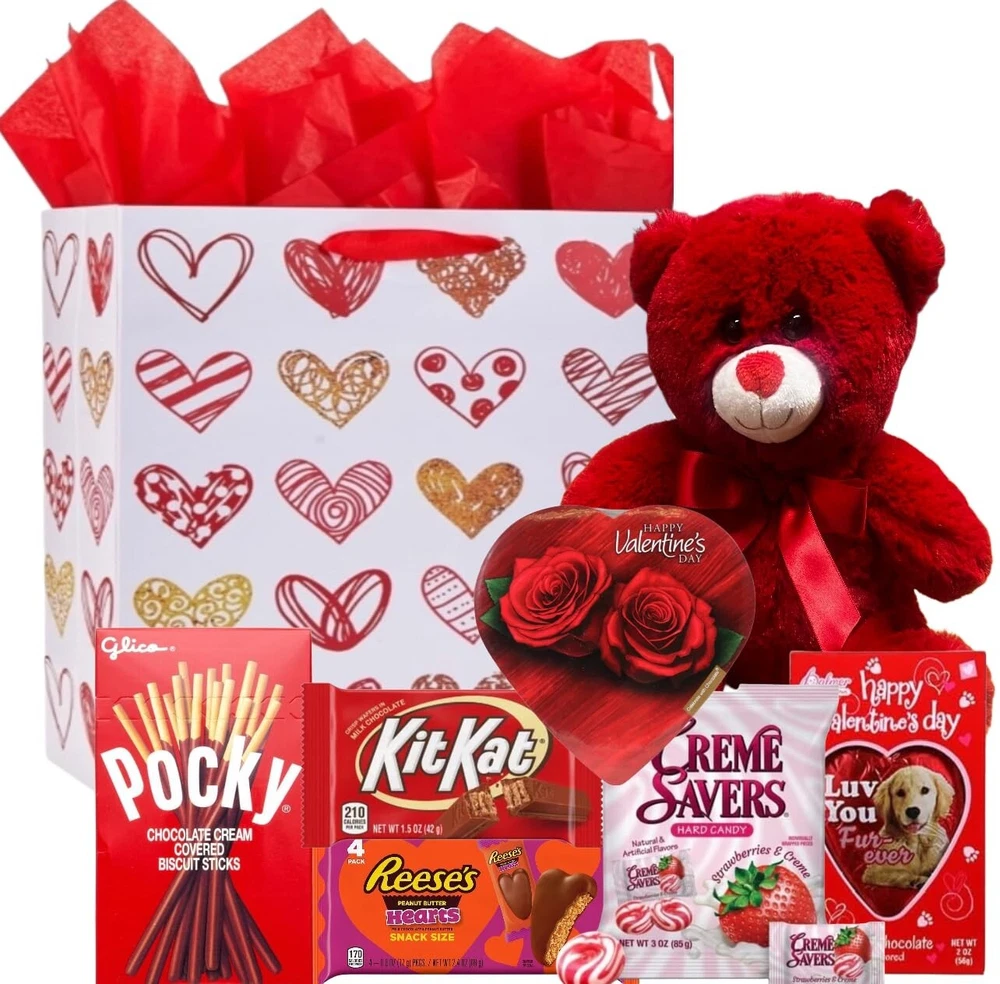 YOU WILL RECEIVE 9 VALENTINES ITEMS - Teddy Bear Plush (RED OR WHITE), Elmer Heart Chocolate, Milk Chocolate Bar, Kit Kat Chocolate Bar, Glico Pocky Chocolate Sticks, Creme Savers Candy, Resees Chocolate Peanut Butter Hearts, V - Day Card, & V-Day Gift Bag ( Design Varies) TEDDY BEAR - This adorable TEDDY BEAR is about 10" inches of huggable, loveable stuffed animal. Complete with a ribbon on his neck, the best way to say I LOVE YOU to the ones you love, during VALENTINE’s Day. (ASSORTED COLORS(White & Red,) ELMER HEART SHAPED CHOCOLATE - Classically packaged, delicious, assorted chocolates! These heart-shaped boxes of candy are an iconic way to express your love on special occasions. Perfect for Valentines Day gifts, classroom Valentines parties, and office treats. Assortments may vary. CREME SAVERS HARD CANDY - Iconic Candy, Individually Wrapped- Mess free individually wrapped fruit-flavored hard candy will keep each delicious piece fresh until it's time for a new bag. Take it Anywhere - Great on the go candy to share with family and friends! Makes the perfect treat for office pantry, candy dish, & Valentines Day. KIT KAT CANDY BAR - Kosher-Certified snack size milk chocolate and wafer candy bars individually wrapped for lasting freshness, & Delectable, snap-worthy snack size treats made of crisp, crunchy wafer bars coated in smooth, creamy milk chocolate perfect for Easter, Valentines Day, Christmas and Halloween candy selections. RESEESE CHOCOLATES - Show off your love by giving the gift of chocolate this Valentines Day! Peanut butter hearts are a decadent treat of creamy peanut butter surrounded by a coat of smooth milk chocolate. Each pack contains 4 individually wrapped hearts making them perfect for candy dishes, care packages, Valentine's gifts, school snacks, movie nights, on-the-go sugar cravings, and more. GLICO POCKY CHOCOLATE STICKS - Pocky makes dessert easy to take on the go in their easy to open, easy to carry, classic red box. The Chocolate Cream Covered Biscuit Sticks are a popular tasty treat, fun for everyone. Just open up a box and pass it around on your Valentines day. VALENTINE GIFT BAG - Give your loved one a special little something in the Sweet Valentines Day Gift Bag. Well decorated bag and it's a totally cute way to carry a present, on Valentine's Day make everyday moments more beautiful and celebrations more joyful...