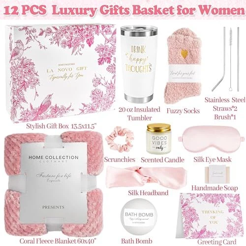 30 Days Return Policy Fast Delivery Trusted seller Valentines Day Gift Basket for Women, Pink Self Care Get Well Soon Gifts, Thinking of You Relaxing Spa Care Package with Blanket, Unique Birthday Gifts for Mom Her Best Friends Sister Wife Product Description Polyster ELEGANT CARE PACKAGE FOR WOMEN: Pink Gifts Basket for Women, a Spa Gifts Set, is a thoughtfully curated selection tailored with love and care to delight and pamper the exceptional woman in your life. It aims to bring her immeasurable joy and offer a heartfelt embrace and affection. Ideal as Birthday Gifts, Valentines Day Gifts for Her Girlfriend or Wife, Mothers Day Gifts for Mom, Anniversary, Christmas Gifts for Women, Relaxation Gifts for Women, Get Well Soon Gifts, Thinking of You Gifts 12PCS SELF CARE GIFTS FOR WOMEN: The Spa Gifts Box for Women, comprising 12PCS of exquisite self-care items, offers a comprehensive range of thoughtfully designed gifts. This stylish box contains a luxurious flannel blanket, a 20oz insulated tumbler, with stainless straws set, a lavender-scented candle, a handmade soap, a bath bomb, a silk eye mask, a silk headband, a scrunchie, fuzzy socks, a greeting card, and an elegant gift box. This unique birthday gift for women is sure to bring warmth to her heart. Send her this spa gift box to enable her to enjoy a cozy and leisurely moment LUXURIOUS CORAL FLANNEL BLANKET: Our gift for women comprises a blanket crafted from luxurious flannel, offering unparalleled softness, coziness, and fluffiness. This blanket ensures total comfort and relaxation, embodying the sentiment " Home Collection Quality Standard". Additionally, the fuzzy socks adorned with a gold heart are exceptionally soft and supremely comfortable, ideal for keeping your lady warm at any time. This birthday gift basket, complete with this blanket, is the perfect way to express your warmest love and hugs INSULATED VACUUM TUMBLER: Crafted from 18/8 food-grade stainless steel, boasting double-walled vacuum insulation, this sweat-resistant 20oz insulated tumbler with lid effectively maintains beverage temperature for up to 10 hours for cold beverages and 5 hours for hot beverages. Ideal for iced coffee, tea, wine, juice, champagne, smoothies, sodas, milkshakes, and more. The uplifting quote "Drink Happy Thoughts" adds a cheerful touch, brightening her days and eliciting a smile as she enjoys her beverage, making it a perfect gift for relaxation or friendship ELEGANT COZY SPA GIFTS: This luxurious lavender-scented candle, crafted from pure plant essential oil and natural soy wax, is non-toxic and designed to burn smokelessly and evenly for an extended duration of up to 30 hours. Accompanying this candle is a handmade goat milk soap and an exquisite bath bomb, both releg a captivating fragrance. These gifts will undoubtedly provide her with an indulgent and bubble bath experience, aiding in the relaxation of her mind and body. A thoughtful and elegant spa gift set, perfect for female birthdays or as a special gift for Mom or Sister EXTRA LUXURY ADDED: The set includes a silk eye mask, a silk hairband, and a hair scrunchie, exceptionally soft, comfortable, lightweight, and fashionable. They are ideal as relaxing accessories to pamper your special lady. Express your heartfelt wishes on the greeting card. offers a satisfaction guarante. If you have any issues with our unique gifts for women, please do not hesitate to contact us for a solution. Enjoy risk-free shopping and select this stylish bath spa gift set as a birthday or Christmas present for your sister, mother, or any special woman in your life WRAPPED WITH CARE AND READY TO GO: Skip the wrapping! Our care package for women is all set to be delivered straight to the recipient's doorstep. This comprehensive wellness and relaxation gift basket is the perfect birthday box, self-care box, or sympathy care package for your friends, family members, or anyone you hold dear. It contains a thoughtful selection of items that promote relaxation, rejuvenation, and overall well-being, making it a thoughtful and meaningful gift for any occasion Shipping Returns Payment Shipping Shipping is FREE to all addresses other than APO/PO boxes in the lower 48 states. All our stock ships from US-based warehouses. Shipped via USPS or UPS (depending on location and package weight) Unless stated otherwise, all orders will ship within 24-72 hours of your payment being processed. Check our feedback to see the great reviews of FAST shipping we offer. Returns As our valued customer, we will do our best to make sure the product you receive arrives to you on time and as expected. If you are not satisfied with your purchase, please contact us within 30 days of receiving your order to process a return. Payment We currently accept payment via eBay managed payments only. Once payment is cleared, we will dispatch your shipment within 1-3 business days. Please refer to the "Shipping" tab for more information regarding shipping speed to your destination.